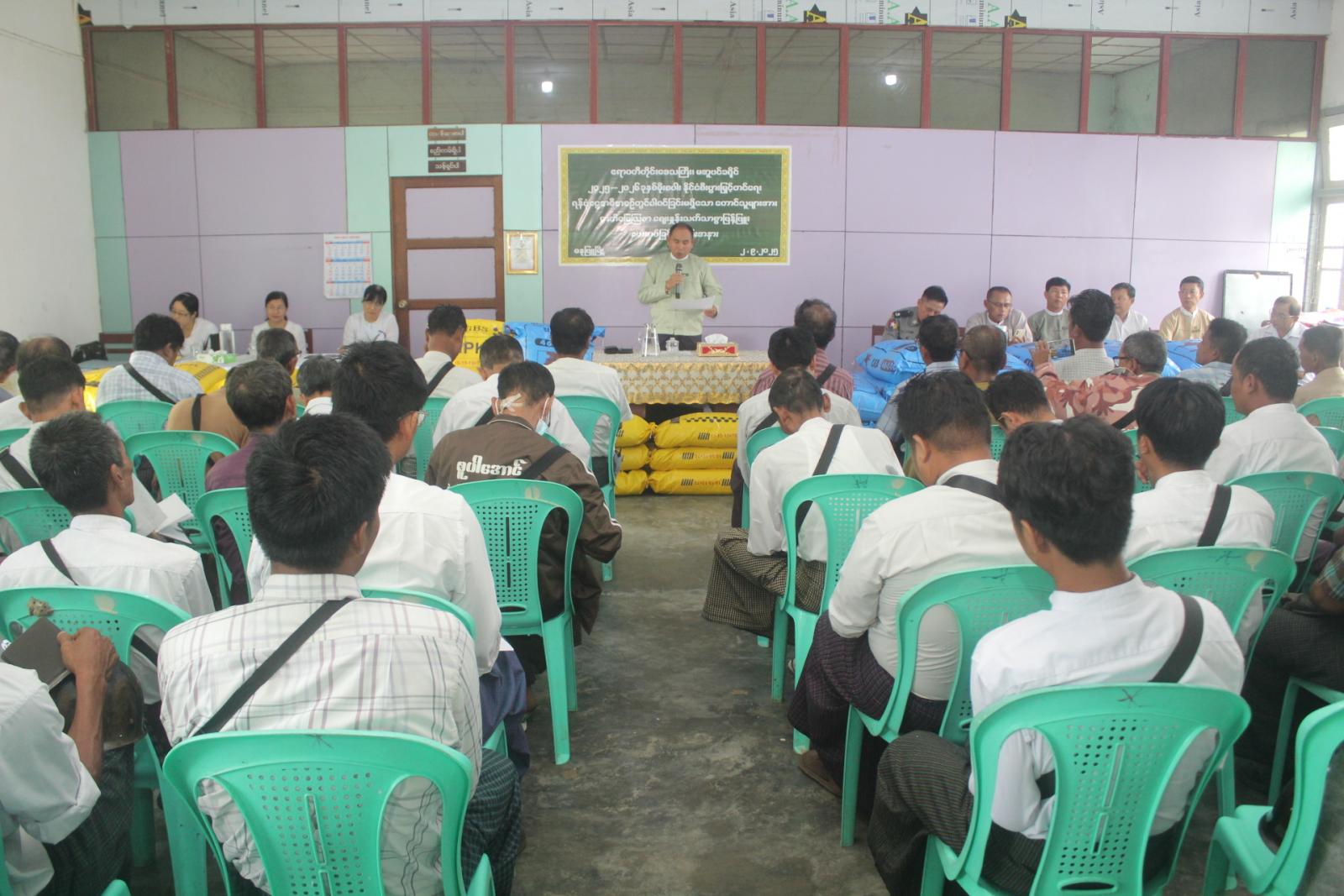 အခမ်းအနားတွင် မြို့နယ်စီမံခန့်ခွဲရေးနှင့်အုပ်ချုပ်ရေးကော်မတီဥက္ကဋ္ဌ၊ မြို့နယ်စိုက်ပျိုး ထုတ်လုပ်မှုတိုးတက်မြင့်မားရေး ကြီးကြပ်မှုကော်မတီဥက္ကဋ္ဌ ဦးကျော်မိုးလွင်က နိုင်ငံ့စီးပွား ရန်ပုံငွေနှင့်အကျုံးမဝင်သည့် မိုးစပါးစိုက်ပျိုးသည့်တောင်သူများအား ဓာတ်မြေဩဇာများကို ဈေးနှုန်းသက်သာစွာဖြင့် ဝယ်ယူသုံးစွဲနိုင်စေရန်အတွက် ပို့ဆောင်ရောင်းချပေးလျက် ရှိပါကြောင်း၊ တောင်သူများအနေဖြင့် ပြင်ပပေါက်ဈေးနှုန်းများထက် သက်သာသောဈေးနှုန်းဖြင့် ဝယ်ယူနိုင်စေရန် သီးနှံပေါ်ပေး (အကြွေး) စနစ်ဖြင့် တောင်သူများ အဆင်ပြေစေရန်ရည်ရွယ်ပြီး ဆောင်ရွက်ပေးပါကြောင်းနှင့် ဓာတ်မြေဩဇာများအသုံးပြုပြီး စပါးအထွက်နှုန်းတိုးပါက တောင်သူဦးကြီးများအဆင်ပြေမှာဖြစ်ပါကြောင်း ပြောကြားခဲ့ ပါသည်။ ဆက်လက်၍ မြို့နယ်ကျေးလက်ဒေသဖွံ့ဖြိုးရေးဦးစီးဌာန၊ လက်ထောက်ညွှန်ကြားရေးမှူး ဒေါ်ခိုင်ချိုလွင်က လုပ်ငန်းအစီအစဉ်နှင့် စာချုပ်စည်းကမ်းများအား ရှင်းလင်းဆွေးနွေးပြေားကြားပြီး၊ မြို့နယ်စိုက်ပျိုးရေးဦးစီးဌာန၊ ဦးစီးအရာရှိ ဦးချစ်ဝင်းနိုင်မှ ဓာတ်မြေဩဇာ ဖြန့်ဖြူးခြင်းအစီအစဉ်အား ရှင်းလင်းဆွေးနွေးပြောကြားခဲ့သည်။