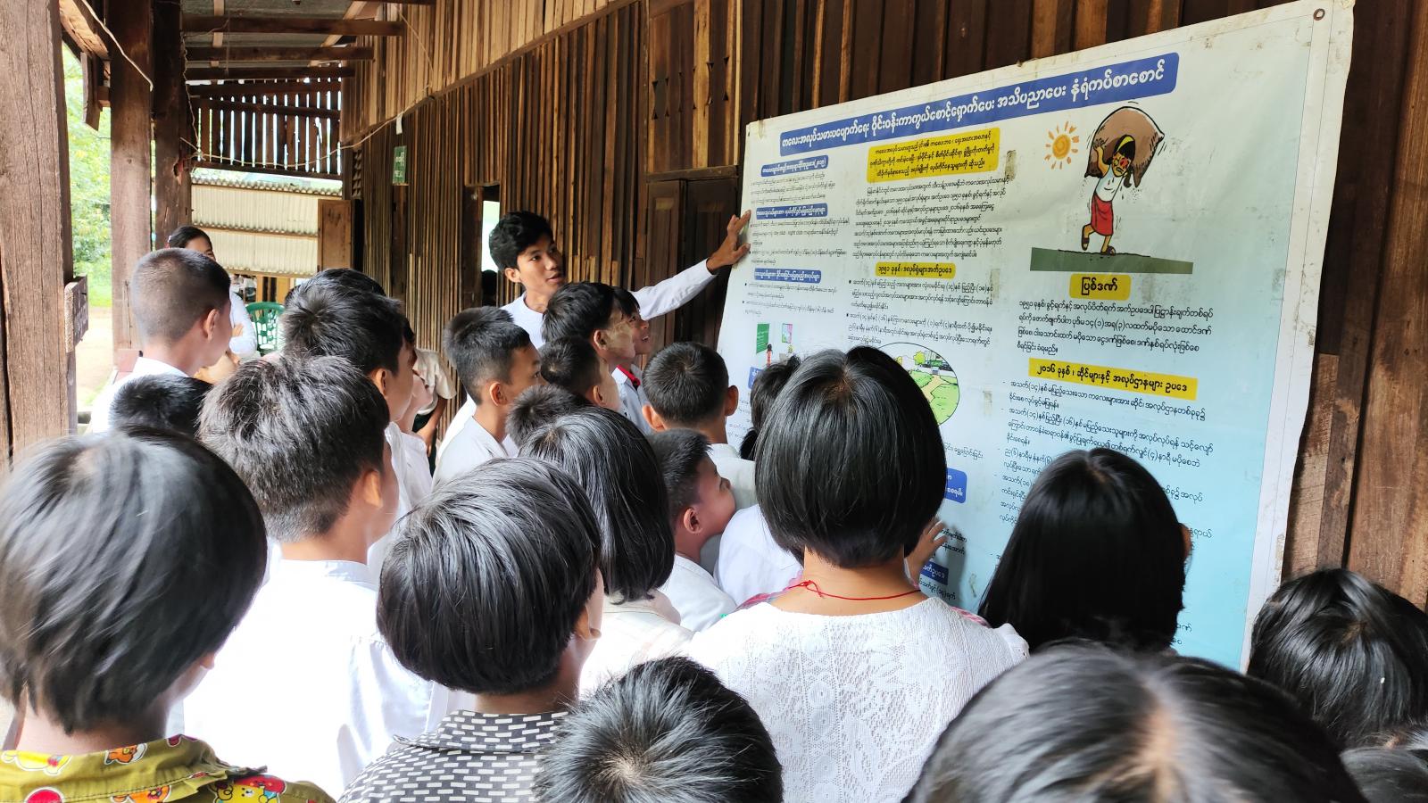 ထို့နောက် ကျောင်းသား၊ ကျောင်းသူများအား ရုပ်ပြပုံပြင်များပြောခြင်း၊ ကိုယ်ကာယလှုပ်ရှားမှု Activity လုပ်ငန်းစဥ်များလိုက်ပါဆောင်ရွက်စေခြင်းများ၊ နယ်လှည့်စာကြည့်တိုက်မှ စာအုပ်၊ စာစောင်များဖတ်ရှုစေခြင်းများပြုလုပ်ခဲ့ပြီး ပြန်ကြားရေးနှင့်ပြည်သူ့ဆက်ဆံရေးဦးစီးဌာနမှခင်းကျင်းပြသထားသည့် ကလေးအလုပ် သမားပပျောက်ရေး နံရံကပ်စာစောင်များကို စိတ်ပါဝင်စားစွာလေ့လာကြည့်ရှုခဲ့ကြောင်းသိရသည်။