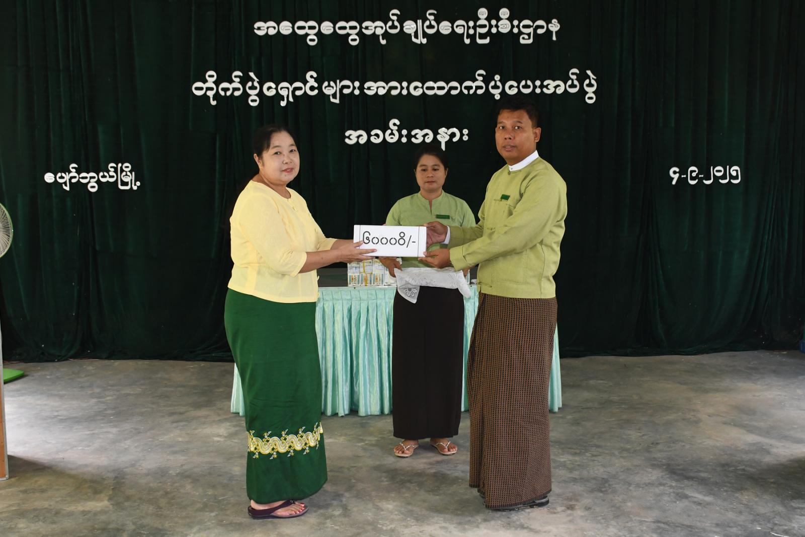 ဦးစွာ မြို့နယ်စီမံခန့်ခွဲရေးနှင့်အုပ်ချုပ်ရေးကော်မတီဥက္ကဋ္ဌ ဦးအာကာစိုး က နိုင်ငံတော်အနေဖြင့် ယာယီ နေရပ်စွန့်ခွာတိမ်းရှောင်လာသူများအတွက် ကူညီဆောင်ရွက်ပေးနေမှုအခြေအနေများကို ရှင်းလင်းဆွေးသည်။ ဆက်လက်၍ အမျိုသားသဘာဝဘေးအန္တရာယ်ဆိုင်ရာစီမံခန့်ခွဲမှုကော်မတီမှပေးအပ်သည့် ယာယီနေရပ်စွန့်ခွာပြည်သူ (၁၉၆၇)ဦးအတွက် တစ်ဦးလျှင် ဧပြီလ၊ မေနှင့်ဇွန်လအတွက် သုံးလစာ ငွေကျပ် (၆၀၀၀၀)နှုန်းကို ခရိုင်စီမံအုပ်ချုပ်ရေးအဖွဲ့ဥက္ကဋ္ဌ ဦးစိန်မြင့်နှင့်တာဝန်ရှိသူများက ထပ်ဆင့်ပေးအပ်ရာ သက်ဆိုင်ရာပြည်သူများက လက်ခံယူခဲ့ကြောင်း သိရသည်။