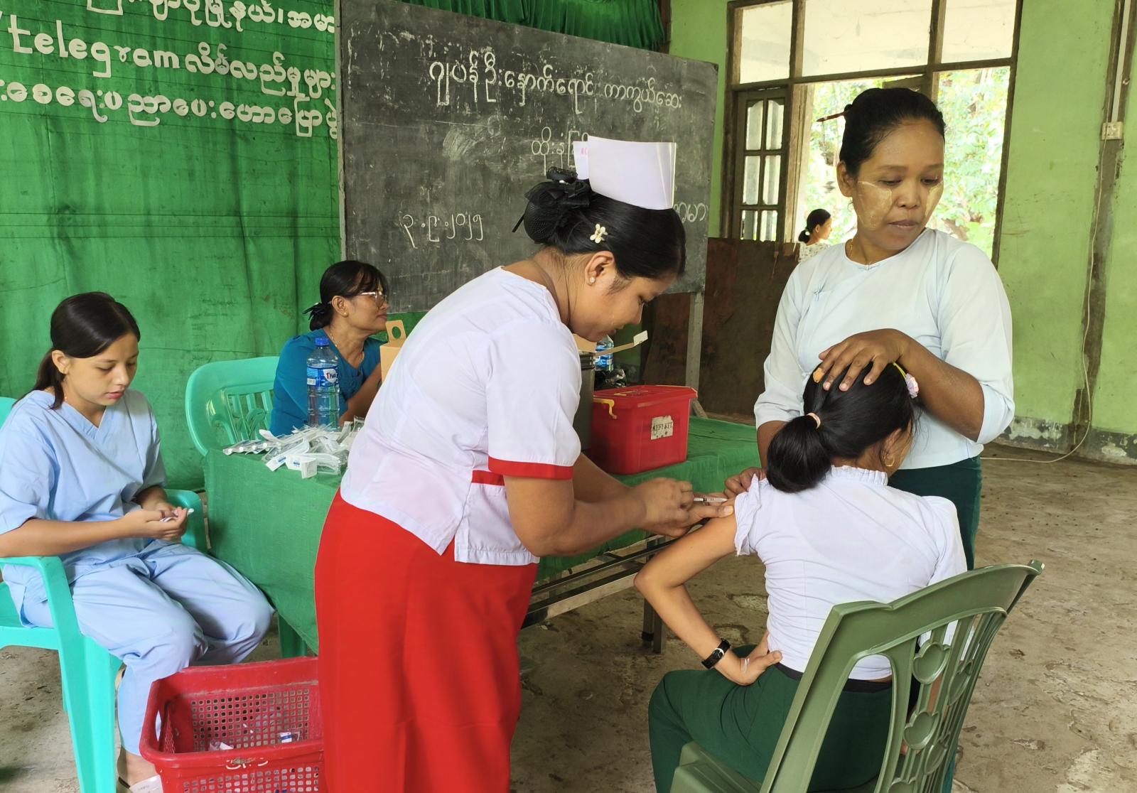 ကာကွယ်ဆေးထိုးနှံပေးခြင်းလုပ်ငန်းများဆောင်ရွက်ရာတွင် ရှေးဦးစွာ ပြည်သူ့ကျန်းမာရေးဦးစီးဌာနမှ ကျန်းမာရေးမှူးဒါ်လှမြတ်မင်းက ဂျပန်ဦးနှောက်ရောဂါအကြောင်း သိကောင်းစရာများကို အသိပညာပေး ဟောပြောခဲ့ပြီး ကျန်းမာရေးဌာနမှ ဆရာမများက အသက် ၁၁ နှစ်မှ အသက် ၁၄ နှစ်အထိ ကျောင်းသား၊ ကျောင်းသူများကို ကာကွယ်ဆေးများ ထိုးနှံပေးခဲ့ပြီး အမာမြို့၊ အ.ထ.ကကျောင်းမှ ကျောင်းသား၊ ကျောင်းသူ (၁၅၆) ဦး၊ အောင်ကုန်းကျေးရွာ၊ အ.မ.ကကျောင်းမှ (၁၉)ဦး၊ လေးပင်ချောင်ကျေးရွာ၊ အ.မ.ကကျောင်းမှ (၁၄)ဦး စုစုပေါင်း (၁၈၉)ဦးတို့ကို ထိုးနှံပေးခဲ့ကြောင်း သိရသည်။