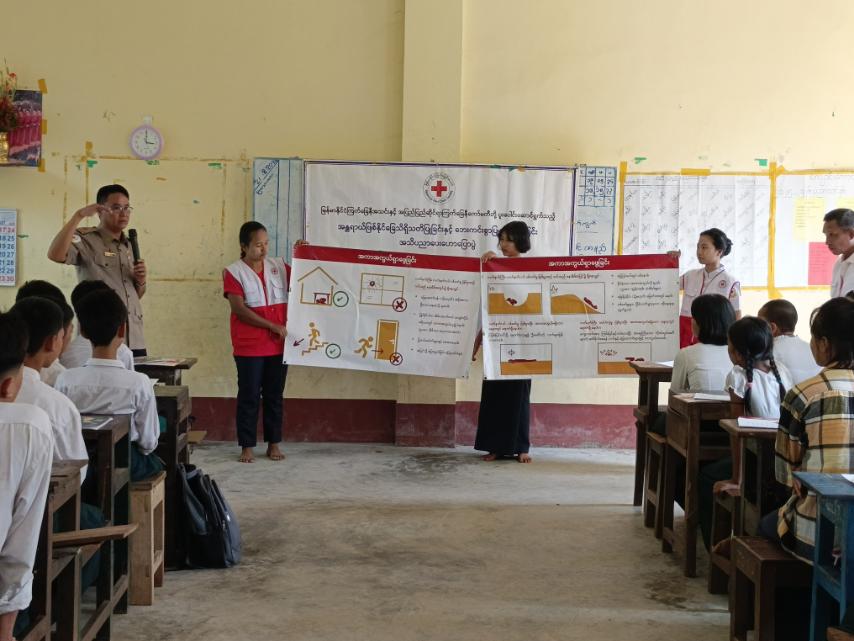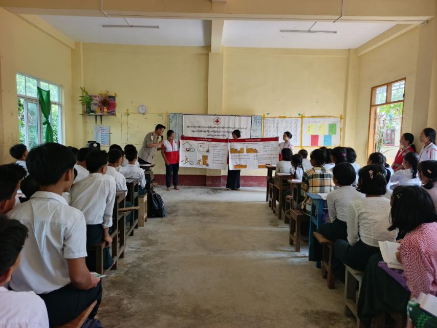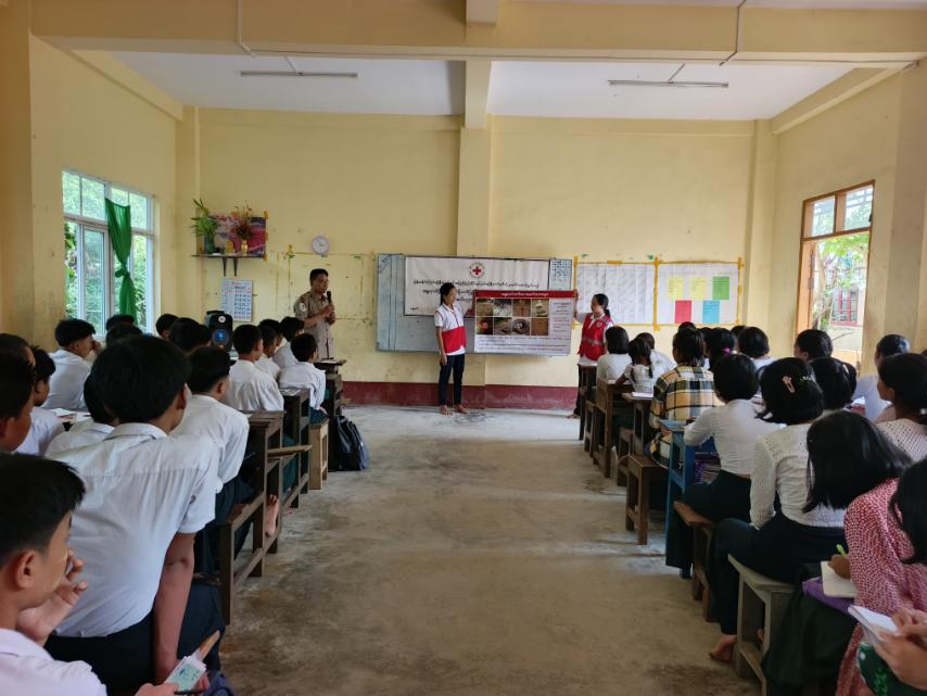 ဆက်လက်၍ မြို့နယ်ကြက်ခြေနီတပ်ဖွဲ့မှူး မင်းမြတ်ဘုန်းက "အန္တရာယ်ဖြစ်နိုင်ခြေသိရှိ သတိပြုခြင်းနှင့် ဘေးကင်းစွာပြုမူနေထိုင်ခြင်း "အသိပညာပေးအနေဖြင့် စစ်လက်နက်ပစ္စည်းများဖြစ်သော မြေမြှုပ်မိုင်း၊ လက်လုပ်မိုင်း၊ ကြိုးဆွဲမိုင်းတို့၏ အန္တရာယ်ကြီးမားပုံများ၊ မိုင်းအန္တရာယ်သတိပေးထားရှိတတ်ပုံများ၊ မိုင်းအားတွေ့ရှိပါက ကြိုတင်ရှောင်ရှားပြီး သက်ဆိုင်ရာအကြီးအကဲများထံ သတင်းပို့ရန် ဗီနိုင်းပိုစတာများဖြင့် ပြသရှင်းလင်းပြောကြားပြီး၊ မြို့နယ်ကြက်ခြေနီတပ်ဖွဲ့ဝင်များက မိုင်းအန္တရာယ်အကြောင်း သိကောင်းစရာလက်ကမ်းစာစောင်များ ဖြန့်ဝေပေးခြင်း၊ ရုပ်ပုံစာအုပ်များ ဝေငှဖတ်ရှုစေခြင်းများ ပြုလုပ်ဆောင်ရွက်ခဲ့ကြောင်း သိရသည်။