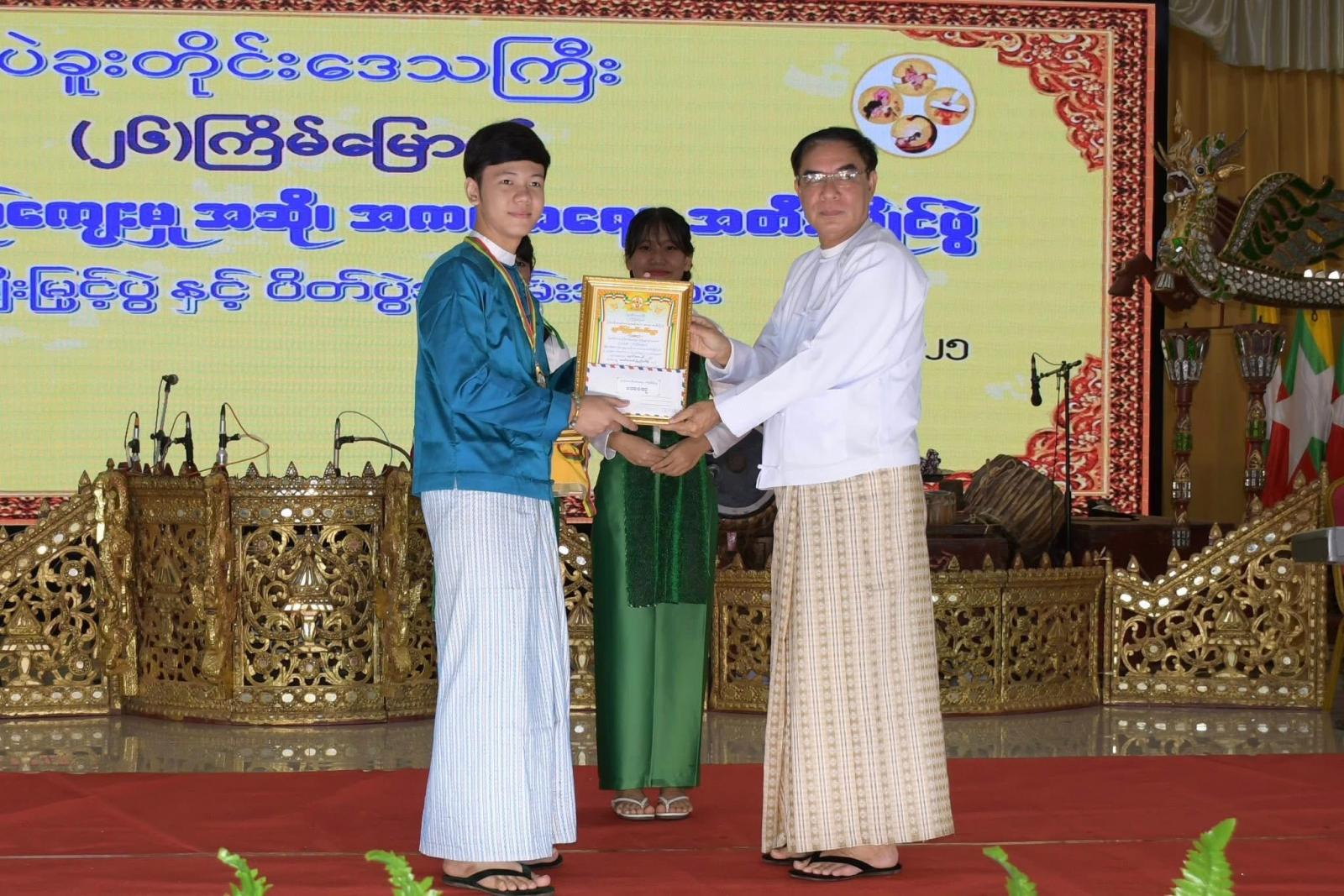 ထို့နောက် ပြိုင်ပွဲဝင်များက သက်ဆိုင်ရာဘာသာရပ်အလိုက် သီဆို၊ တီးခတ်၊ ကပြ ဖျော်ဖြေတင်ဆက်ခဲ့ကြသည်။ ၎င်းနောက် တိုင်းဒေသကြီးဝန်ကြီးချုပ် ဦးမျိုးဆွေဝင်းနှင့် ဇနီး ဒေါ်စိုးစိုးသက်တို့က ဖျော်ဖြေတင်ဆက်ခဲ့ကြသည့် ပြိုင်ပွဲဝင်များအား ဂုဏ်ပြုဆုနှင့် ပြိုင်ပွဲတွင် အနီးကပ်ကြီးကြပ်ပေးခဲ့ကြသည့် နည်းပြနှင့်ဒိုင်အဖွဲ့များအတွက် ဂုဏ်ပြုပန်းခြင်းနှင့် အမှတ်တရဂုဏ်ပြုလက်ဆောင်များပေးအပ်ခဲ့ကာ ဂုဏ်ပြုဆုရရှိသည့် ပြိုင်ပွဲဝင်များနှင့် ဒိုင်အဖွဲ့များအား ရင်းရင်းနှီးနှီး လိုက်လံနှုတ်ဆက်အားပေးစကား ပြောကြားခဲ့သည်။