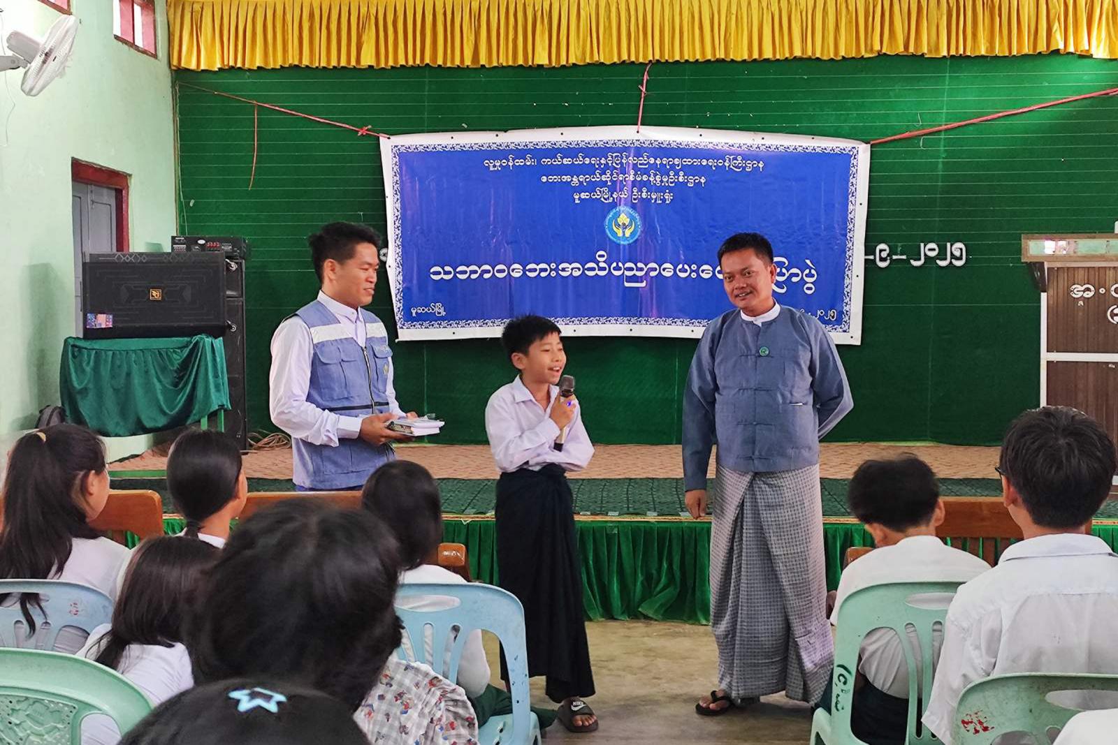 ယင်းနောက် တက်ရောက်လာသော ကျောင်းသား/ကျောင်းသူများအား မေးခွန်းများမေးမြန်းကာ ပြန်လည်ဖြေကြားနိုင်သူအား လက်ဆောင်များပေးအပ်ခဲ့ပြီး သဘာဝဘေးအန္တရာယ်ဆိုင်ရာ အသိပညာပေးလက်ကမ်းစာစောင်များကို ကျောင်းသား/ကျောင်းသူများထံ ဖြန့်ဝေပေးအပ်ခဲ့ကြောင်း သိရှိရပါသည်။