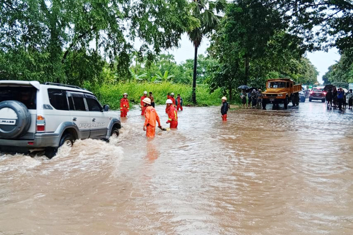အဆိုပါ ရေကျော်ချောင်းရိုးများ ကားလမ်းပိတ်ဆို့မှုဖြစ်ပေါ်ရာသို့ မြို့နယ်မီးသတ်ဦးစီးမှူး ဦးသန်းမြင့်ဦးဆောင်သည့် မီးသတ်တပ်ဖွဲ့ဝင် သန္ဓေ(၁+၁၀)ဦး အရန်မီးသတ်(၃)ဦး ပေါင်း၁၄ ဦးနှင့် မြန်မာ နိုင်ငံရဲတပ်ဖွဲ့ဝင်များ၊ လုံခြုံရေးတပ်ဖွဲ့ဝင်များက ရေကြောင်းလမ်းပြ ကူညီကယ်ဆယ်မှုများဆောင်ရွက်လျက်ရှိပြီး၊ မြို့နယ်စီမံခန့်ခွဲရေးနှင့်အုပ်ချုပ်ရေးကော်မတီဥက္ကဋ္ဌ၊ မြို့နယ်အုပ်ချုပ်ရေးမှူး ဦးသန်းလွင်နှင့် ဆည်မြောင်းနှင့်ရေအသုံးချမှု စီမံခန့်ခွဲရေးဦးစီးဌာန မြို့နယ်ဦးစီးမှူး ဦးကျော်ဆွေဝင်း၊ လမ်းဦးစီးဌာန မြို့နယ်ဦးစီးမှူး ဦးထွန်းအောင်ကြင်တို့မှ အနီးကပ်ကြီးကြပ်ဆောင်ရွက်လျက်ရှိကြောင်းသိရပြီး ညနေ (၃:၄၀) နာရီတွင် ရေအနည်းငယ်ကျဆင်းသွားပြီဖြစ်၍ ယာဉ်အသွားအလာများ ပုံမှတ်အတိုင်းဖြတ်ကျော်မောင်းနှင်လျက်ရှိကြောင်း သိရသည်။