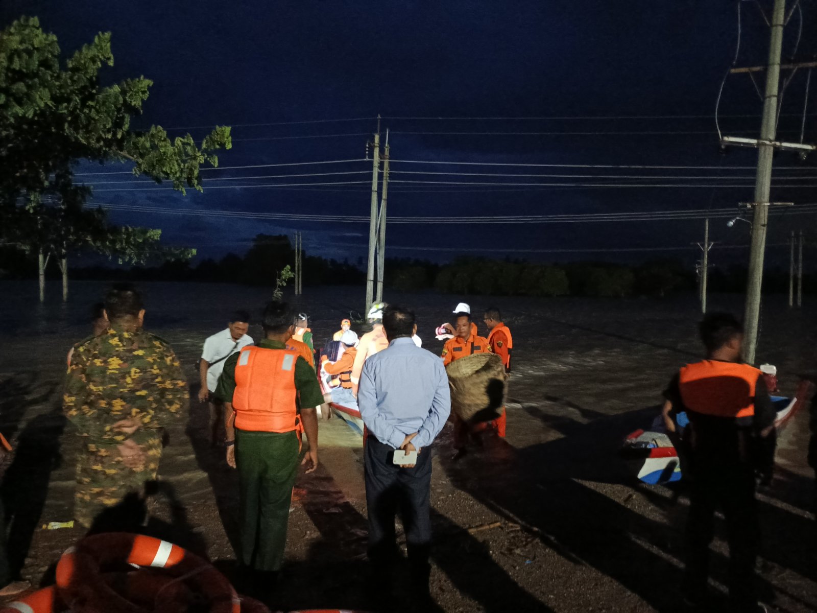 နေပြည်တော်ကောင်စီဝင် ဦးမြင့်စိုးသည် တာဝန်ရှိသူများနှင့်အတူ ယမန်နေ့မွန်းလွဲပိုင်းက လယ်ဝေးမြို့နယ်အတွင်း မိုးသည်းထန်စွာရွာသွန်းမှုကြောင့် ရေကြီးမှုဖြစ်ပွားသည့် ကျေးရွာများသို့ သွားရောက်ကြည့်ရှုသည်။