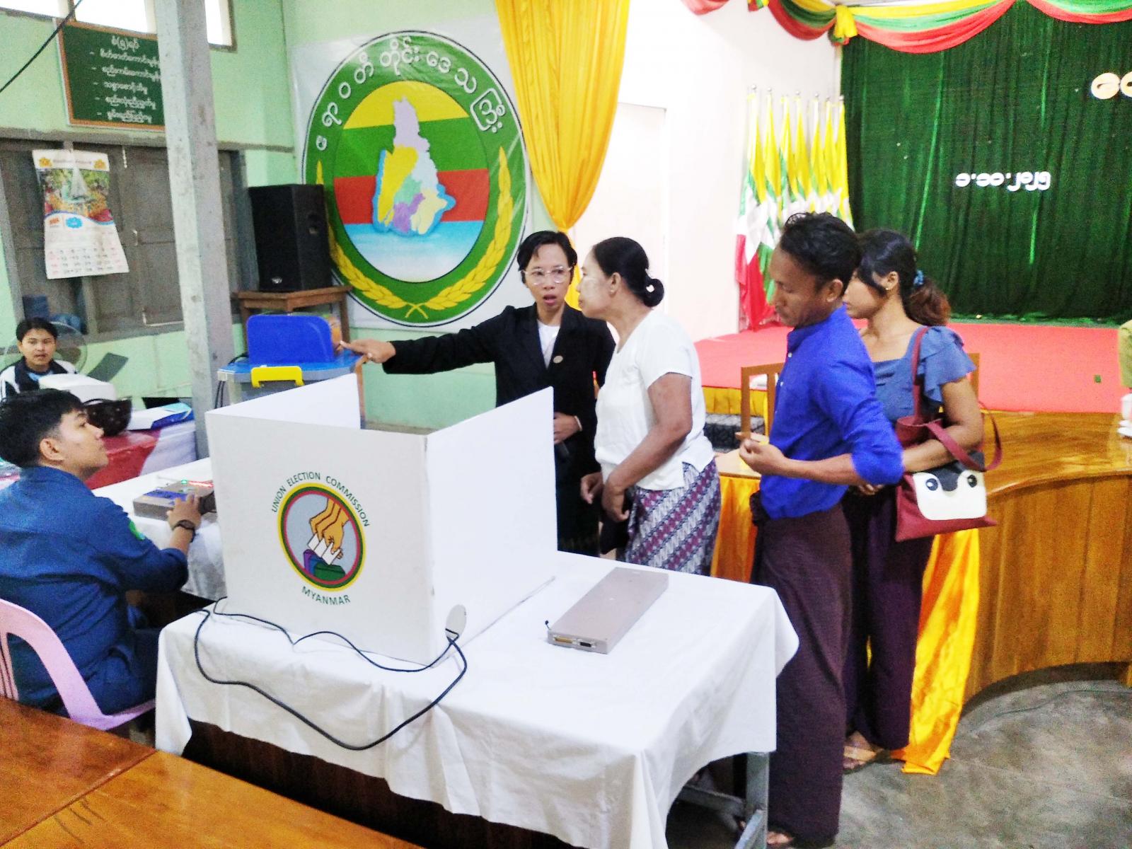 ပထမဦးစွာ မြို့နယ်စီမံခန့်ခွဲရေးနှင့် အုပ်ရေးကော်မတီအဖွဲ့ဥက္ကဋ္ဌ ဦးဝင်းလှိုင်က အဖွင့်အမှာစကားပြောကြားရာ၌ နေရပ်စွန့်ခွာပြည်သူများအား မည်သည့်နေရာတွင် မဲပေးနိုင်ရေး၊ ရောက်ရှိမြို့ နယ်အတွင်း မဲပေးမည်ဆိုပါက သက်ဆိုင်ရာ ရပ်ကွက်/ကျေးရွာအုပ်ချုပ်ရေးမှူးရုံးမှတဆင့် ပုစံ(၃-က) ဖြင့် လျှောက်ထားနိုင်ကြောင်း၊ နိုင်ငံသားစိစစ်ရေးကတ်ပြားများ ပျက်စီး၊ ပျောက်ဆုံးမှုရှိပါ လိုအပ်သလို သက်ဆိုင်ရာဌာနများဖြင့် ချိတ်ဆက်၍ ကူညီဆောင်ရွက်ပေးသွားမည်ဖြစ်ကြောင်း ပြောကြားပြီး၊ မြို့နယ်ရွှေးကောက်ပွဲအရာရှိ ဒေါ်ဝင်းဝင်းမြင့်က မဲဆန္ဒရှင်ပြည်သူများအား မဲပေးစက်၏ ဖွဲ့စည်းတည်ဆောက်ပုံ MEVM စက်ဖြင့်စမ်းသပ်မဲပေးမှု အဆင့်ဆင့်လုပ်ငန်းစဉ်များကိုရှင်းလင်း ပြောကြားသည်။ ဆက်လက်၍ အခမ်းအနားသို့ တက်ရောက်လာကြသည့် နေရပ်စွန့်ခွာပြည်သူများက တစ်ဦးချင်း လက်တွေ့စမ်းသပ်မဲပေးကြရာ တာဝန်ရှိသူများ ရှင်းလင်းပြသပေးကြသည်။