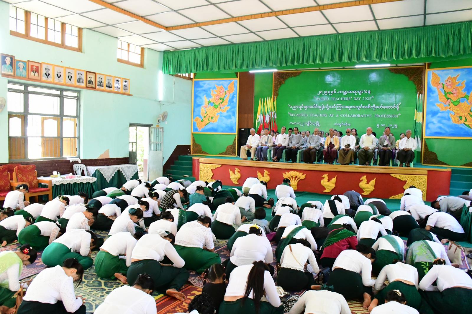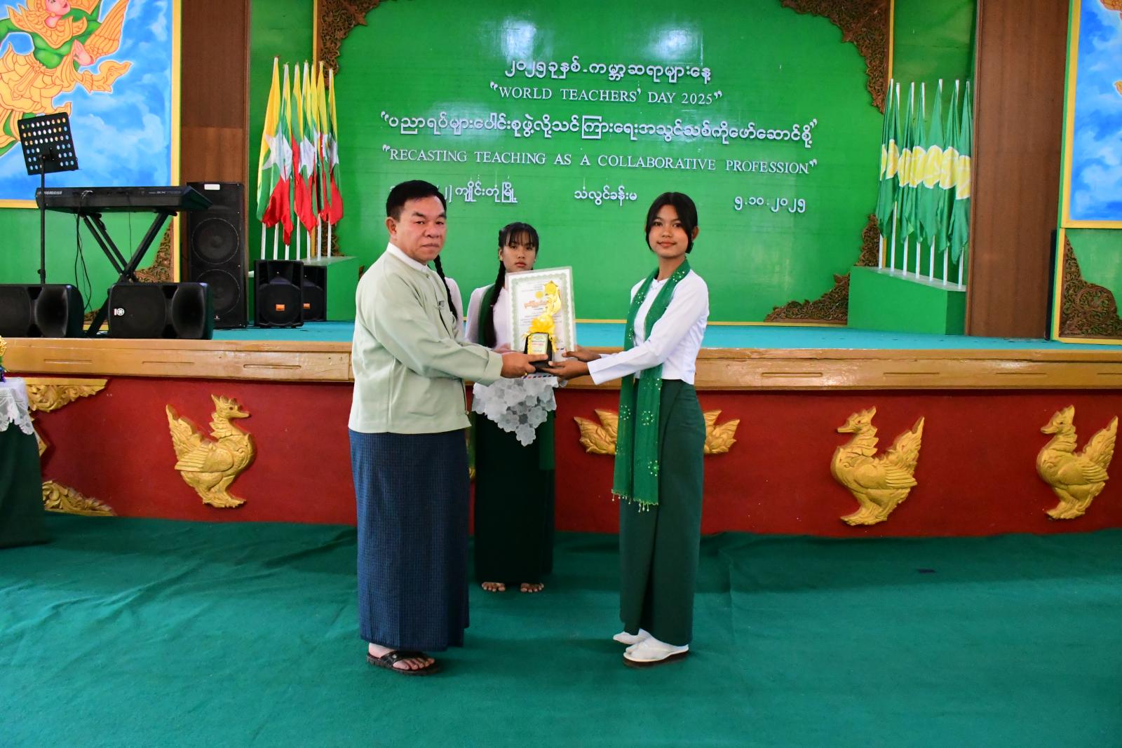 ထို့နောက် ၂၀၂၅ ခုနှစ် ကမ္ဘာ့ဆရာများနေ့အထိမ်းအမှတ် အခြေခံပညာအထက်တန်း၊ အလယ်တန်းဆင့် စာစီစာကုံးနှင့် ကဗျာပြိုင်ပွဲများတွင် ဆုရရှိသည့် ကျောင်းသား၊ ကျောင်းသူများအား တာဝန်ရှိသူများက ဆုများအသီးသီးပေးအပ်ချီးမြှင့်ပြီး အခြေခံပညာဦးစီးဌာနမှ အငြိမ်းစားယူခဲ့သော ကန်တော့ခံ အသက်(၇၀)နှစ်နှင့်အထက် ဆရာကြီး၊ ဆရာမကြီး (၆၇)ဦးအား ဂါရဝပြုငွေသားများနှင့်အတူ စုပေါင်းကန်တော့ခဲ့ကြကြောင်း သိရသည်။