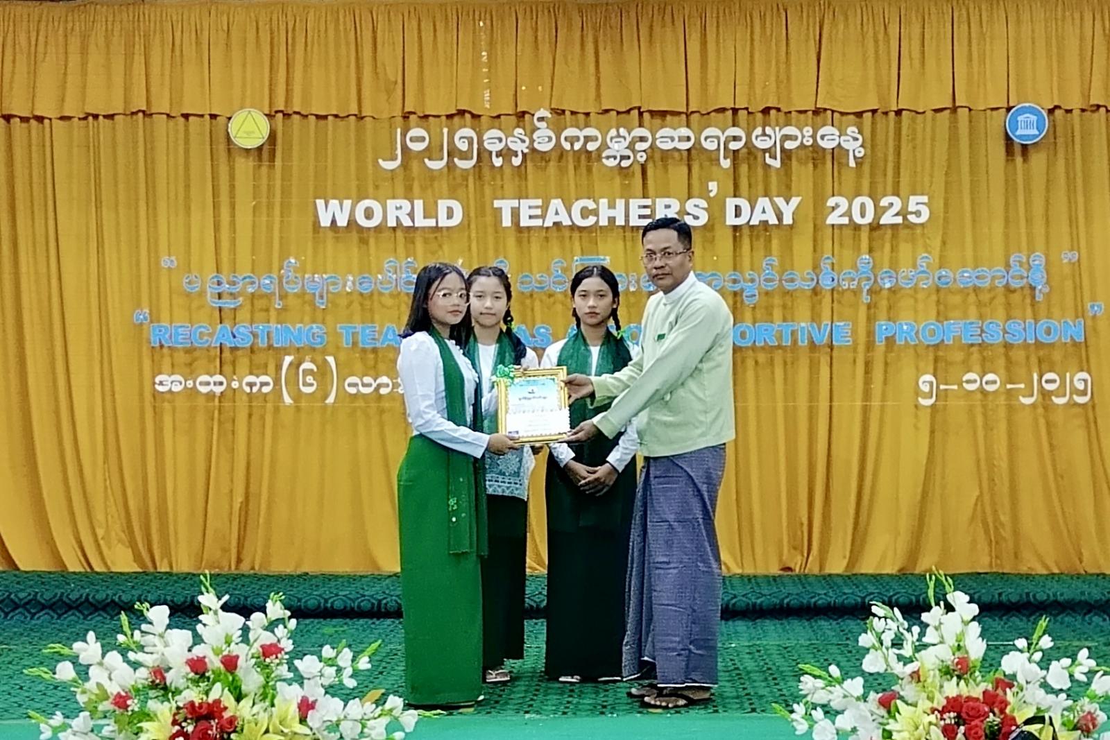 ဆက်လက်၍ ကမ္ဘာ့ဆရာများနေ့အထိမ်းအမှတ် အခြေခံပညာအထက်တန်းနှင့် အလယ်တန်းအဆင့် စာစီစာကုံး၊ ကဗျာပြိုင်ပွဲများတွင် ထူးချွန်ဆုရရှိသည့် ကျောင်းသားကျောင်းသူများအား ပြည်နယ်အစိုးရအုပ်ချုပ်ရေးအဖွဲ့ခွဲ(ရှမ်းမြောက်)ဥက္ကဋ္ဌနှင့် တာဝန်ရှိသူများက ထူးချွန်ဂုဏ်ပြုဆုများ ပေးအပ်ချီးမြှင့်ခဲ့ပြီး လားရှိုးမြို့နယ်မှ ဆရာ၊ ဆရာမများက “ဆရာ” သီချင်းသီဆို၍ အခမ်းအနားအား ပိတ်သိမ်းခဲ့ကြောင်း သိရသည်။