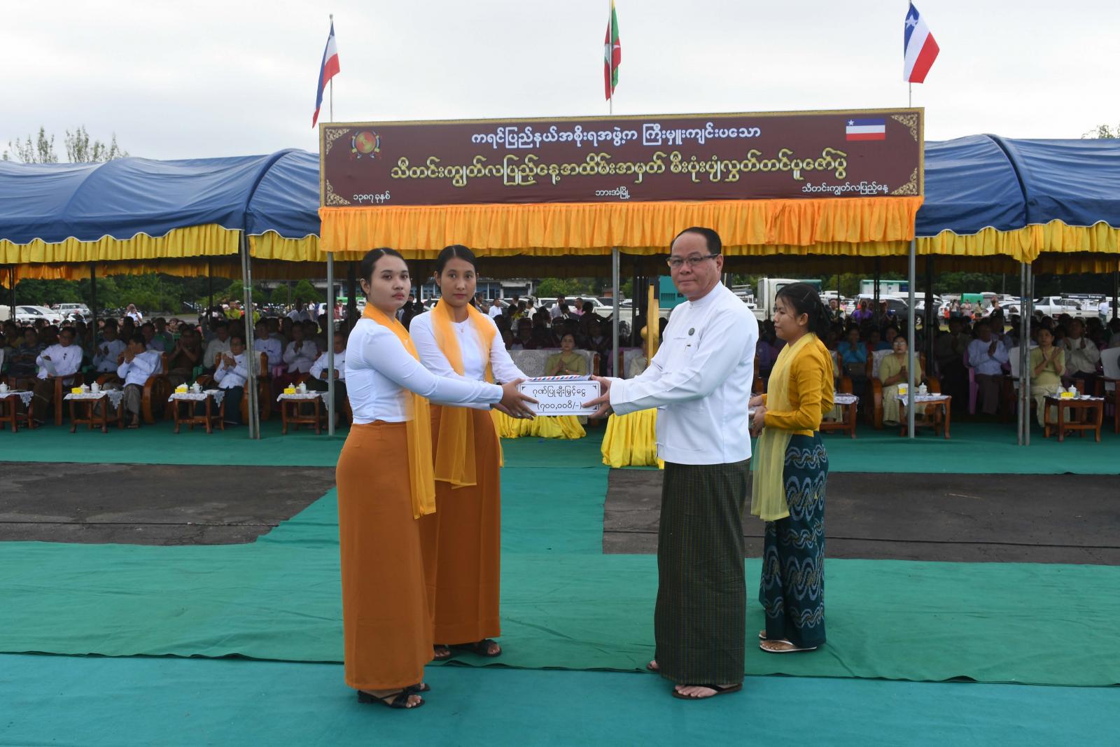 အဆိုပါအခမ်းအနားသို့ နိုင်ငံတော်ဩဝါဒါစရိယ ဥဒေါင်းကျောင်းဆရာတော် အဂ္ဂမဟာ သဒ္ဓမ္မဇောတိကဓဇ မဟာဂန္ထဝါစကပဏ္ဍိတ ဘဒ္ဒန္တခန္ထီဝဏ္ဏ အမှူးပြုသော ထေရ်ကြီးဝါကြီး ဆရာတော်ကြီး(၁၁)ပါး ကြွရောက်ချီးမြှင့်တော်မူကြပြီး ပြည်နယ်ဝန်ကြီးချုပ်နှင့် ဧည့်ပရိတ်သတ်အပေါင်းတို့က နိုင်ငံတော်ဩဝါဒါစရိယ ဥဒေါင်းကျောင်းဆရာတော် အဂ္ဂမဟာသဒ္ဓမ္မဇောတိကဓဇ မဟာဂန္ထဝါစကပဏ္ဍိတ ဘဒ္ဒန္တခန္ထီဝဏ္ဏထံမှ ကိုးပါးသီလခံယူဆောက်တည်ကြသည်။
