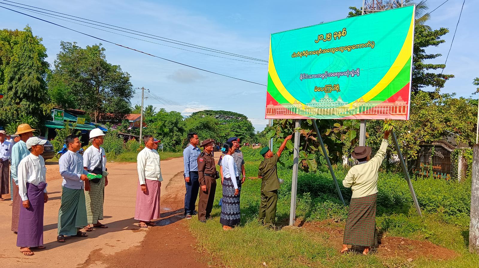 အဆိုပါ ဗီနိုင်းပိုစတာများစိုက်ထူရာတွင် မြို့နယ်စီမံခန့်ခွဲရေးနှင့်အုပ်ချုပ်ရေးကော်မတီ အဖွဲ့ဝင်(၁) ဗိုလ်မှူးထွန်းလင်းထက်အောင်နှင့် အဖွဲ့ဝင်များ၊ မြို့နယ်အထွေထွေအုပ်ချုပ်ရေးဦးစီးဌာန ဒုတိယမြို့နယ်အုပ်ချုပ်ရေးမှူး ဦးအောင်ဇင်ဦး၊ ဌာနဆိုင်ရာအကြီးအကဲများ၊ မြို့နယ်ရွေးကောက်ပွဲကော်မရှင်ဥက္ကဋ္ဌနှင့် အဖွဲ့ဝင်များ၊ ရပ်ကွက်အုပ်ချုပ်ရေးမှူးများက ၂၀၂၅ ခုနှစ်၊ ပါတီစုံဒီမိုကရေစီအထွေထွေရွေးကောက်ပွဲ "နိုင်ငံသားအခွင့်အရေးမဆုံးရှုံးဖို့ မဲပေးကြစို့" ဗီနိုင်းပိုစတာ ၃ ခုအား လူအသွားအလာများသည့် ဗိုလ်ချုပ်ဆောင်ဆန်းလမ်းမကြီး၊ ပြည်တော်အေးလမ်းနှင့် ဗိုလ်တေဇလမ်းမကြီးလမ်းဆုံများတွင် အမွှေးနံ့သာများ ပက်ဖျန်း၍ စိုက်ထူခဲ့ပြီး ဖဲကြိုးဖြတ်ဖွင့်လှစ်ခဲ့ကြောင်း သိရသည်။