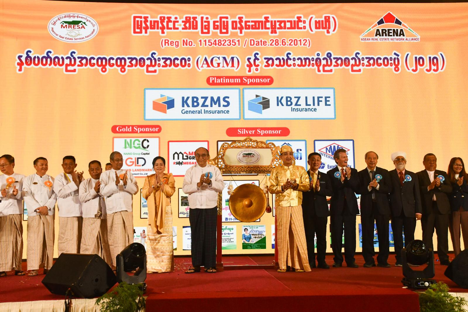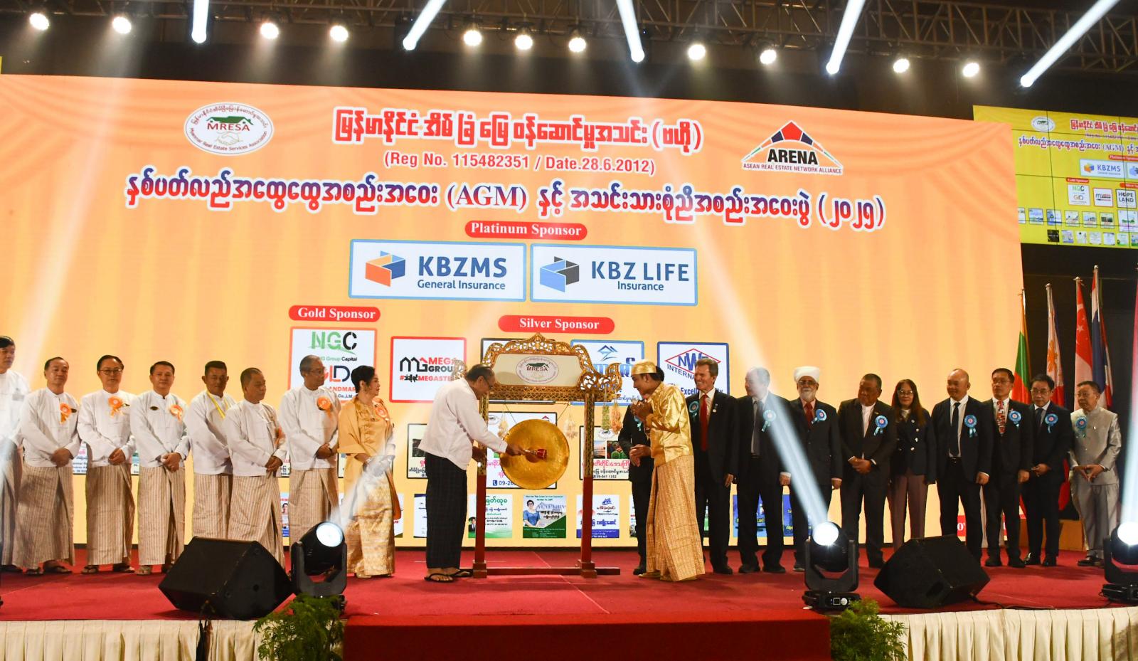 ဦးစွာမြန်မာနိုင်ငံ အိမ်ခြံမြေဝန်ဆောင်မှုအသင်း (ဗဟို)ဥက္ကဋ္ဌနှင့် နိုင်ငံခြားဧည့်သည်တော်များနေရာယူကြပြီး မြန်မာနိုင်ငံသတင်းမီဒီယာကောင်စီဥက္ကဋ္ဌ ဒေါက်တာ တင်ထွန်းဦး ကမောင်း ၉ ချက်တီး၍ မြန်မာနိုင်ငံအိမ်ခြံမြေဝန်ဆောင်မှုအသင်း(ဗဟို) နှစ်ပတ်လည် အထွေထွေအစည်းအဝေး (2025) ကိုဖွင့်လှစ်ပေးပြီးအိုးစည်အဖွဲ့နှင့် သူငယ်တော်အကဖြင့် ဖျော်ဖြေတင်ဆက်ကြသည်။