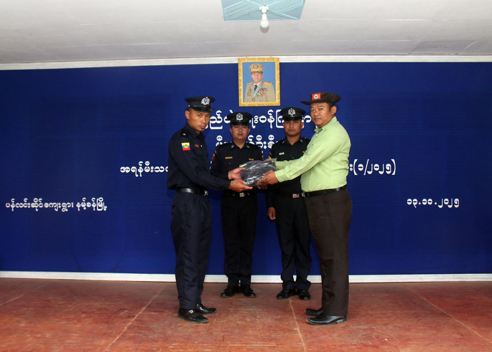ထို့နောက် မြို့နယ်စီမံခန့်ခွဲရေးနှင့်အုပ်ချုပ်ရေးကော်မတီဥက္ကဋ္ဌ ဦးနေမျိုးထွန်းနှင့် မတ်ကျန်းဌာနေပြည်သူ့စစ်အဖွဲ့မှ ဒုတိယဥက္ကဋ္ဌ ဦးခမ်းစိန်မိန်းတို့က ရှမ်းပြည်နယ်မီးသတ်ဦးစီးမှူးရုံးက ထောက်ပံ့ပေးအပ်သည့် မီးငြှိမ်းသတ်ရေးဝတ်စုံနှင့် ရှာဖွေကယ်ဆယ်ရေးဝတ်စုံများအား ပေးအပ်ခဲ့ရာ သင်တန်းသားများကိုယ်စား သင်တန်းသား(၂)ဦးက လက်ခံရယူခဲ့သည်။