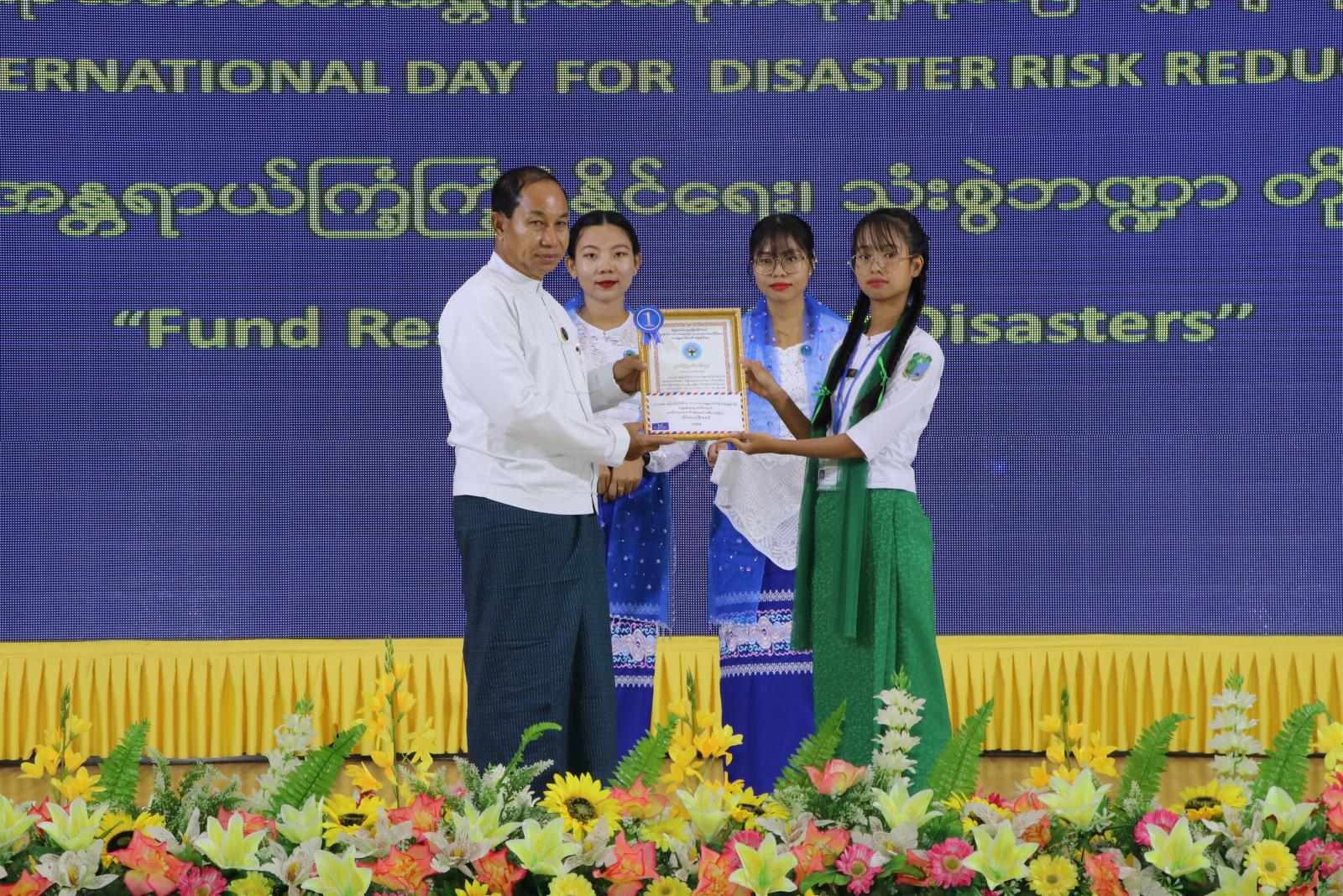 ဆက်လက်၍ တိုင်းဒေသကြီးဝန်ကြီးချုပ်က ၂၀၂၅-ခုနှစ်၊ အပြည်ပြည်ဆိုင်ရာ သဘာဝဘေး အန္တရာယ် ထိခိုက်ဆုံးရှုံးနိုင်ခြေလျော့ချရေးနေ့ အထိမ်းအမှတ်အကြို အထက်တန်းအဆင့် စာစီစာကုံးပြိုင်ပွဲတွင် ပထဆုရရှိခဲ့သူအားလည်းကောင်း၊ တိုင်းဒေသကြီးတရားသူကြီးချုပ်က ဒုတိယဆုရရှိခဲ့သူအားလည်းကောင်း၊ တိုင်းဒေသကြီး လူမှုရေးရာဝန်ကြီးက တတိယဆုရရှိခဲ့သူ အားလည်းကောင်း ဂုဏ်ပြုချီးမြှင့်ငွေများနှင့် ဂုဏ်ပြုဆု လက်မှတ်များအား ပေးအပ်ချီးမြှင့်ကြသည်။