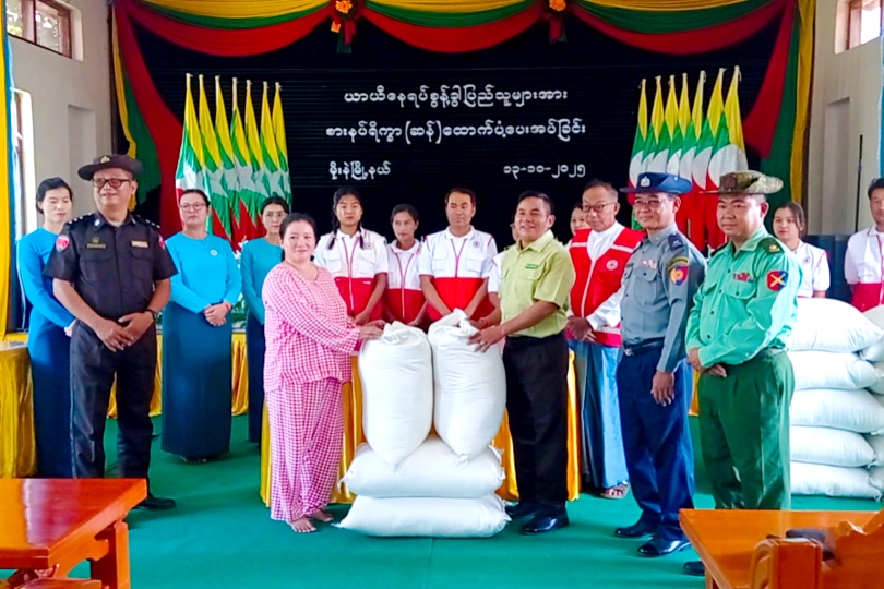 ထို့နောက် နေရပ်စွန့်ခွာပြည်သူ အိမ်ထောင်စု ၉၀ စု တို့မှ လူဦးရေ ၄၂၄ ဦးတို့အတွက် ဆန် ၁၇၀ အိတ်ကို မြို့နယ်စီမံခန့်ခွဲရေးနှင့် အုပ်ချုပ်ရေးကော်မတီဥက္ကဋ္ဌနှင့် အဖွဲ့ဝင်များ၊ မြို့နယ်ကြက်ခြေနီအသင်းခွဲဥက္ကဋ္ဌနှင့် တာဝန်ရှိသူများက ပေးအပ်ရာ ယာယီနေရပ်စွန့်ခွာ ပြည်သူများက လက်ခံရယူခဲ့ကြောင်းသိရသည်။