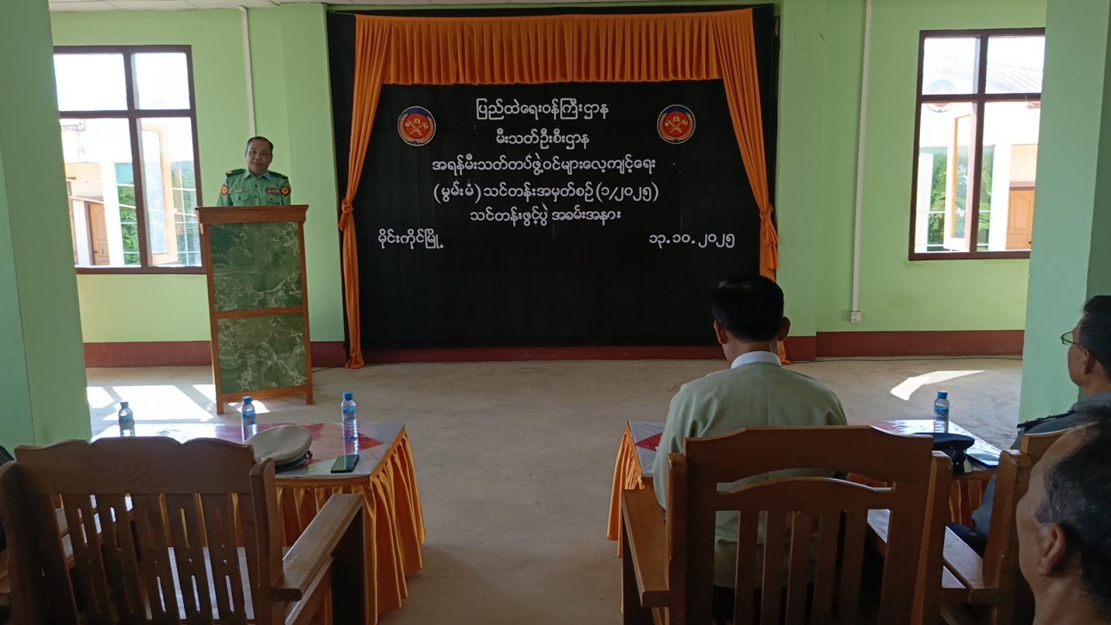 ရှမ်းပြည်နယ်(တောင်ပိုင်း)၊ လွိုင်လင်ခရိုင်၊ မိုင်းကိုင်မြို့နယ်၌ အရန်မီးသတ်တပ်ဖွဲ့ဝင်များ လေ့ကျင့်ရေး(မွမ်းမံ)သင်တန်းအမှတ်စဉ် (၁/၂၀၂၅) ဖွင့်ပွဲအခမ်းအနားကို အောက်တိုဘာ ၁၃ ရက် နံနက်(၉)နာရီအချိန်က မိုင်းကိုင်မြို့နယ် မီးသတ်စခန်း၌ ကျင်းပပြုလုပ်ခဲ့သည်။