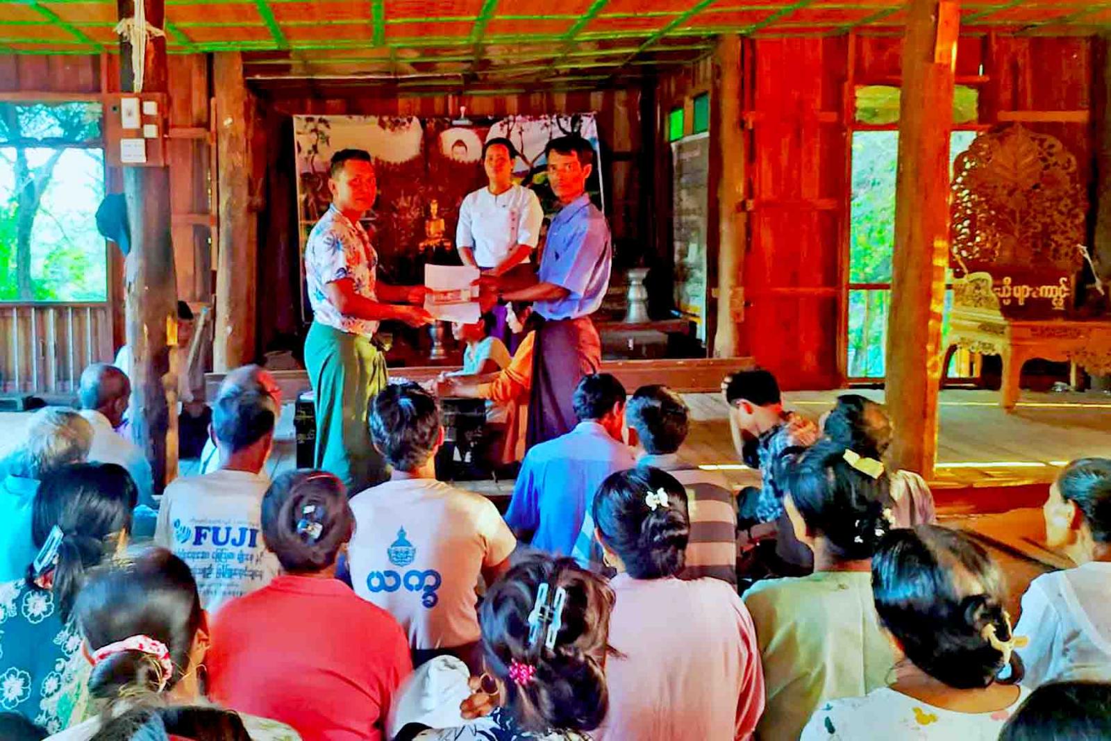 ဆက်လက်၍ စီမံကိန်းတာဝန်ခံ ဝန်ထမ်းများက ချေးငွေထုတ်ချေးရာတွင် လိုက်နာရမည့် စည်းကမ်းချက်များ၊ စီမံကိန်းကာလနှင့် ချေးငွေအတိုးနှုန်းသတ်မှတ်ချက်များကို ရှင်းလင်းပြောကြားပြီး အကြီးတန်းစာရေး ဒေါ်ငြိမ်းငြိမ်းစံက စီမံကိန်းရန်ပုံငွေကျပ် ၄၅ ဒသမ ၂ သန်းကို ကျောင်းစုကျေးရွာရှိ မြစိမ်းရောင်ကျေးရွာစီမံကိန်းလုပ်ငန်းအဖွဲ့ဝင်များထံ လွှဲပြောင်းပေးအပ်သည်။