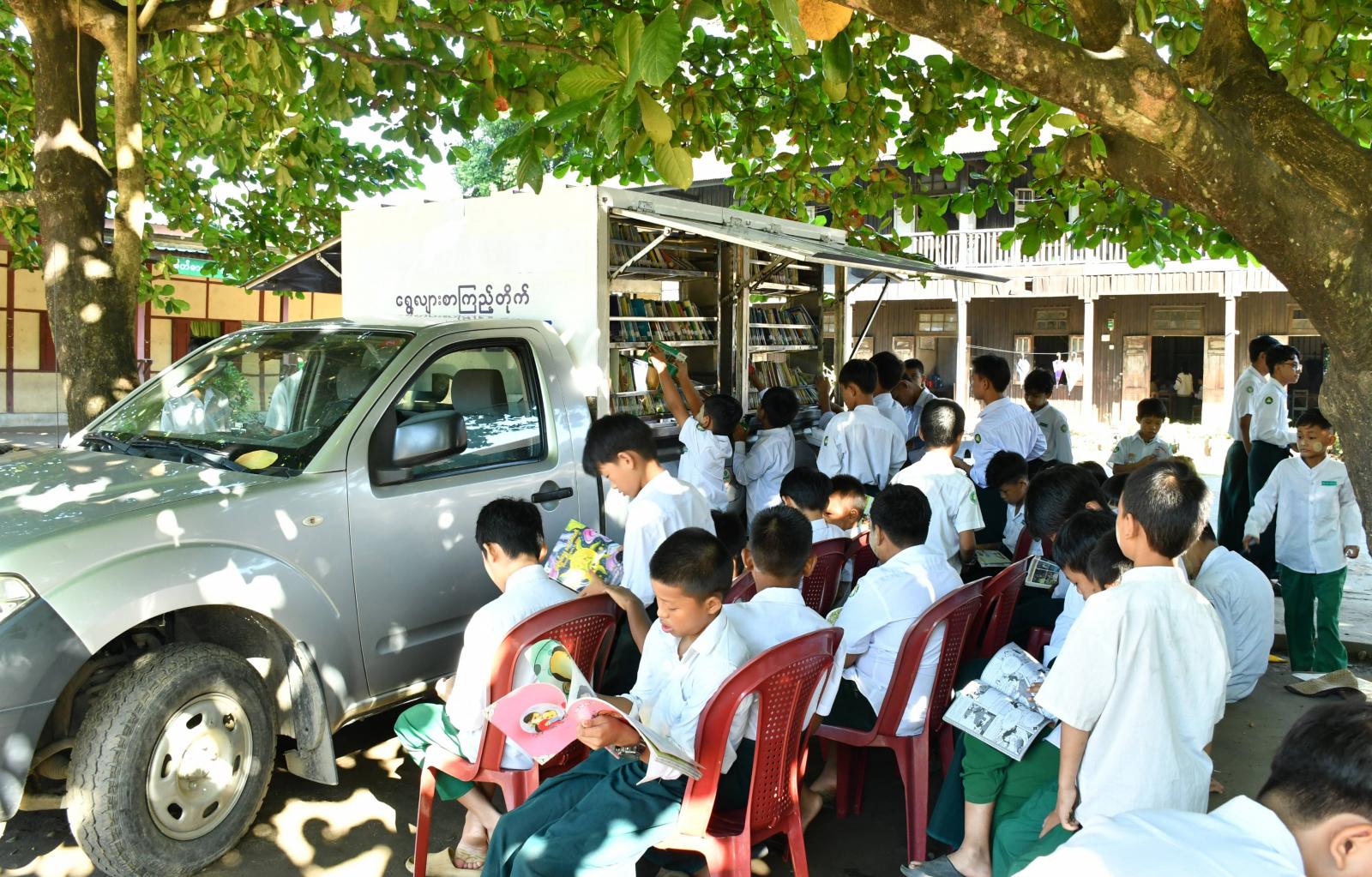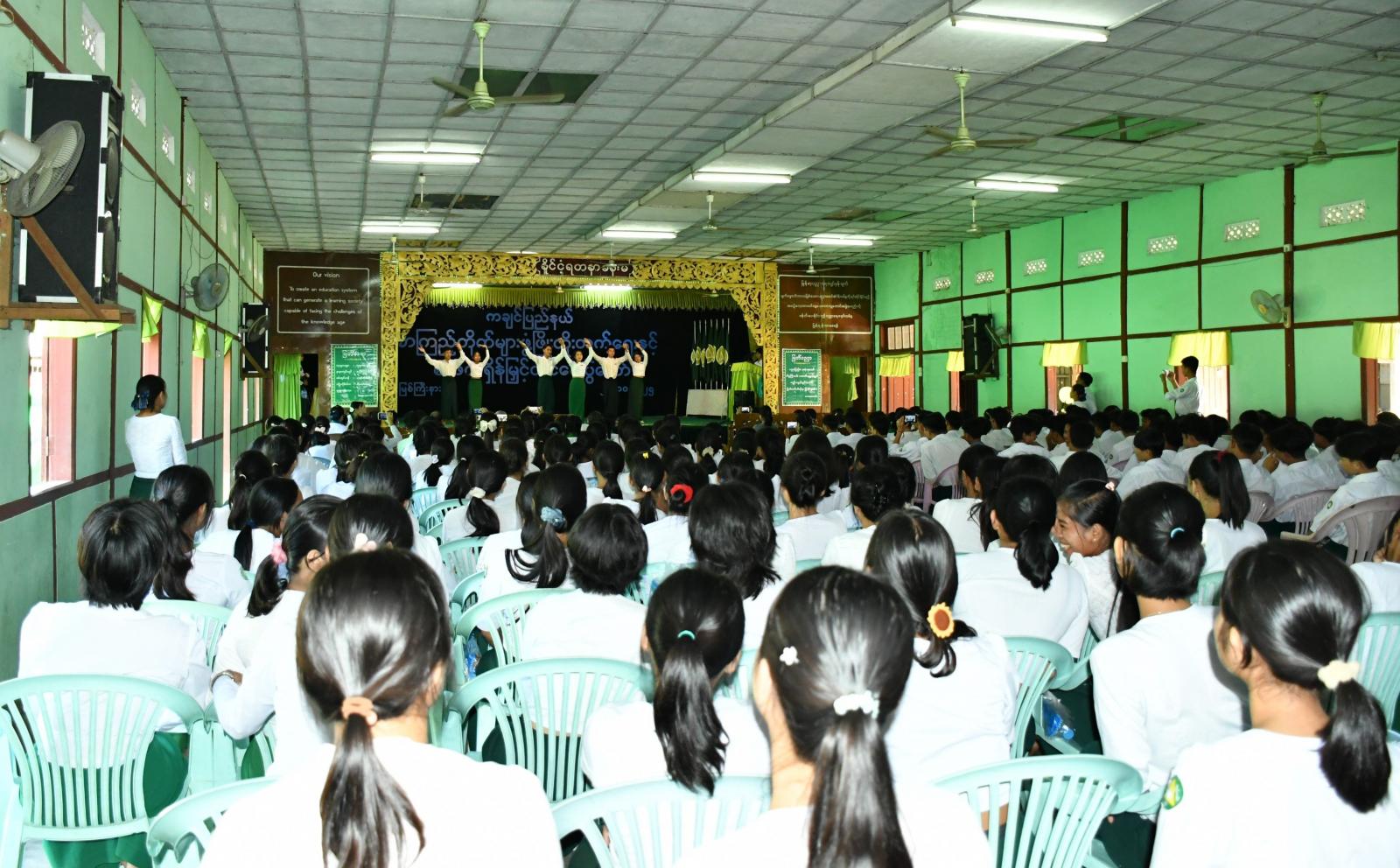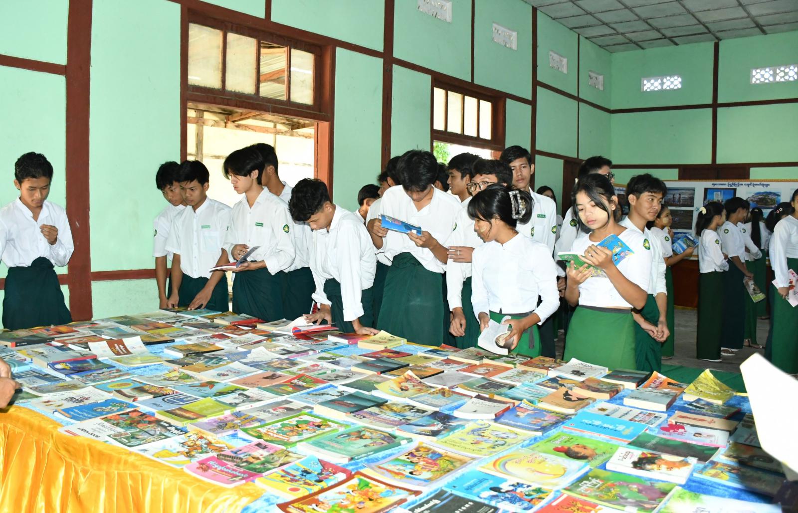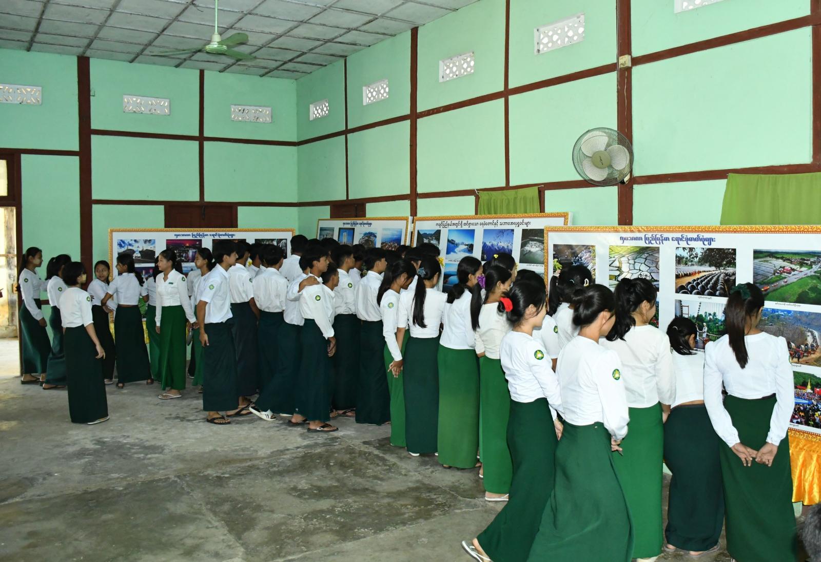 ယင်းနောက် ကျောင်းသား/ ကျောင်းသူလေးများက ပညာဘဏ်တိုက်စာကြည့်တိုက် တေးသီချင်းဖြင့် သီဆိုဖျော်ဖြေခဲ့ကြပြီး ကျောင်းခန်းမအတွင်း ပြန်ကြားရေးနှင့်ပြည်သူ့ဆက်ဆံရေးဦးစီးဌာနက ဖွင့်လှစ်ပြသထားသည့် လှပသာယာပြည်မြန်မာ ဓာတ်ပုံပြခန်းနှင့် သုတ/ ရသစာအုပ်စာစောင်ပြခန်းများကို တက်ရောက်လာသူများနှင့် ကျောင်းသား/ကျောင်းသူလေးများက စိတ်ဝင်စားစွာလေ့လာကြည့်ရှုခဲ့ကြသည်။