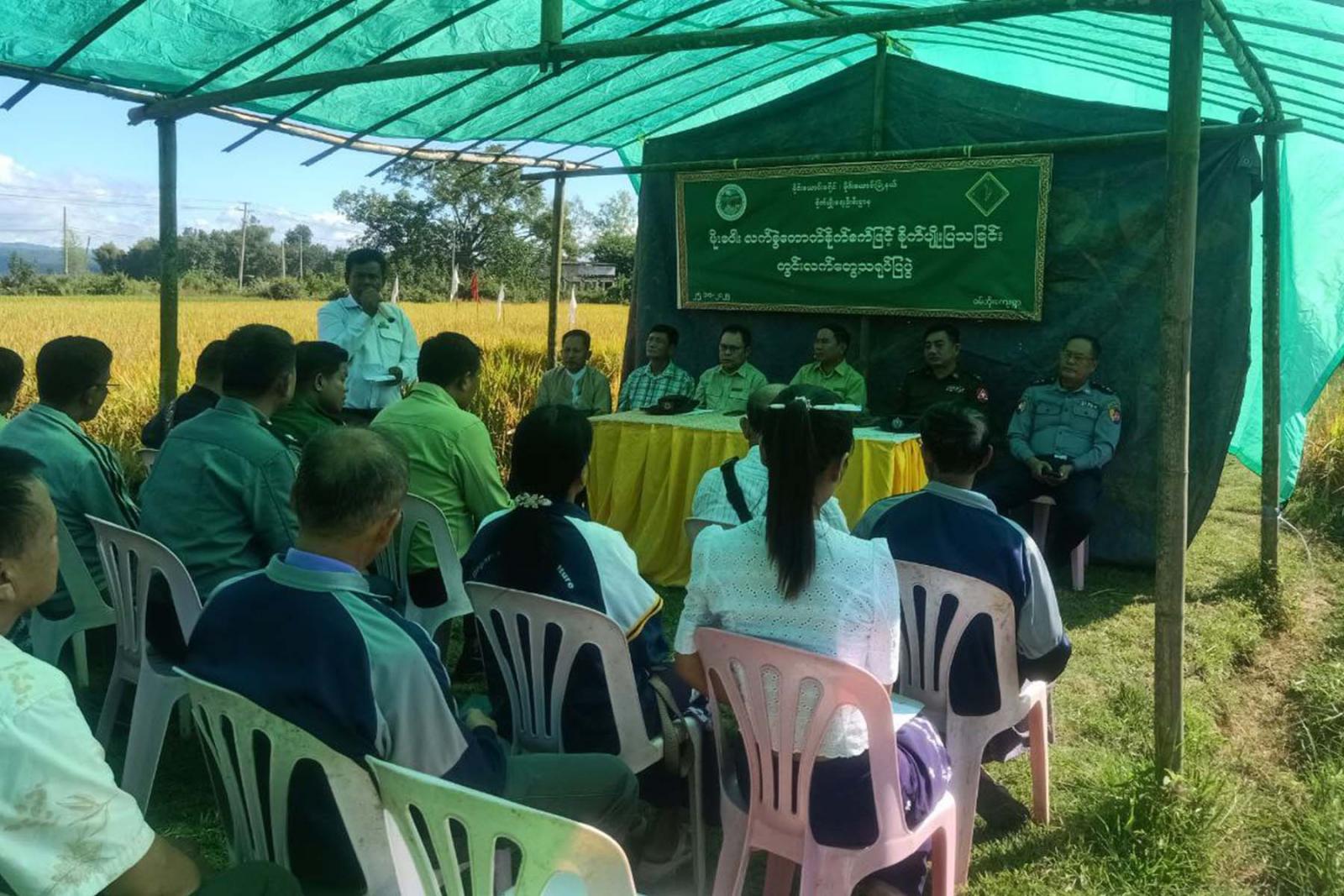 ရှေးဦးစွာ ခရိုင်စီမံခန့်ခွဲရေးနှင့်အုပ်ချုပ်ရေးကော်မတီဥက္ကဋ္ဌ ခရိုင်အုပ်ချုပ်ရေးမှူး ဦးဝေမောင်က အမှာစကားပြောကြား၍ မြို့နယ်စိုက်ပျိုးရေးဦးစီးဌာန ဦးစီးအရာရှိ ဦးကျော်ကျော်မိုးက မြို့နယ်အတွင်း လက်စွဲကောက်စိုက်စက်ဖြင့် မိုးစပါး စိုက်ပျိုးမှုအခြေအနေနှင့် ဆောင်ရွက်ခဲ့မှုလုပ်ငန်းစဉ်အဆင့်ဆင့်ကို ရှင်းလင်းပြောကြားပြီး တက်ရောက်လာသူများအား စိုက်ပျိုးရေးအသိပညာပေး လက်ကမ်းစာစောင်များ ဖြန့်ဝေပေးခဲ့သည်။