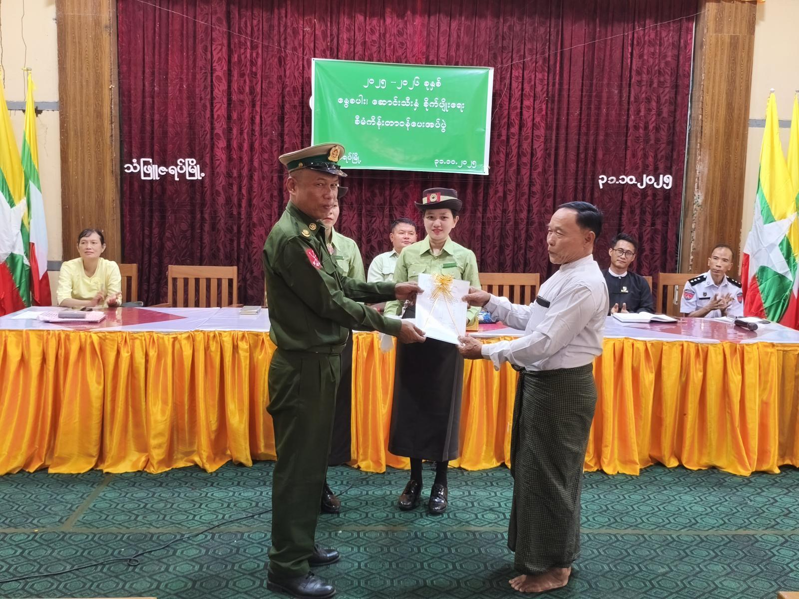 ထို့နောက် မြို့နယ်စီမံခန့်ခွဲရေးနှင့် အုပ်ချုပ်ရေးကော်မတီဥက္ကဋ္ဌနှင့်အဖွဲ့ဝင်များ၊ မြို့နယ်စိုက်ပျိုး ထုတ်လုပ်မှုတိုးတတ်မြင့်မားရေးအဖွဲ့ဝင်များမှ စီမံကိန်းသီးနှံများဖြစ်သည့် နွေစပါး( ၂၇၈ )ဧက၊ နှမ်း(၆၅)ဧက၊ နေကြာ(၁၇၆၀)ဧက၊ မတ်ပဲ(၁၅)ဧက နှင့် ပဲတီစိမ်း(၆၅)ဧက တို့အား ရပ်ကွက်/ ကျေးရွာအုပ်စုအုပ်ချုပ်ရေးမှူးများထံသို့ ရပ်/ကျေး အုပ်စုအလိုက်စိုက်ပျိုးရမည့် စီမံကိန်းသီးနှံများအား တာဝန်ပေးအပ်ခဲ့ပြီး၊ လပတ်လုပ်ငန်းညှိနှိုင်းအစည်းအဝေးကို ဆက်လက်ဆောင်ရွက်ခဲ့ကြကြောင်း သိရသည်။