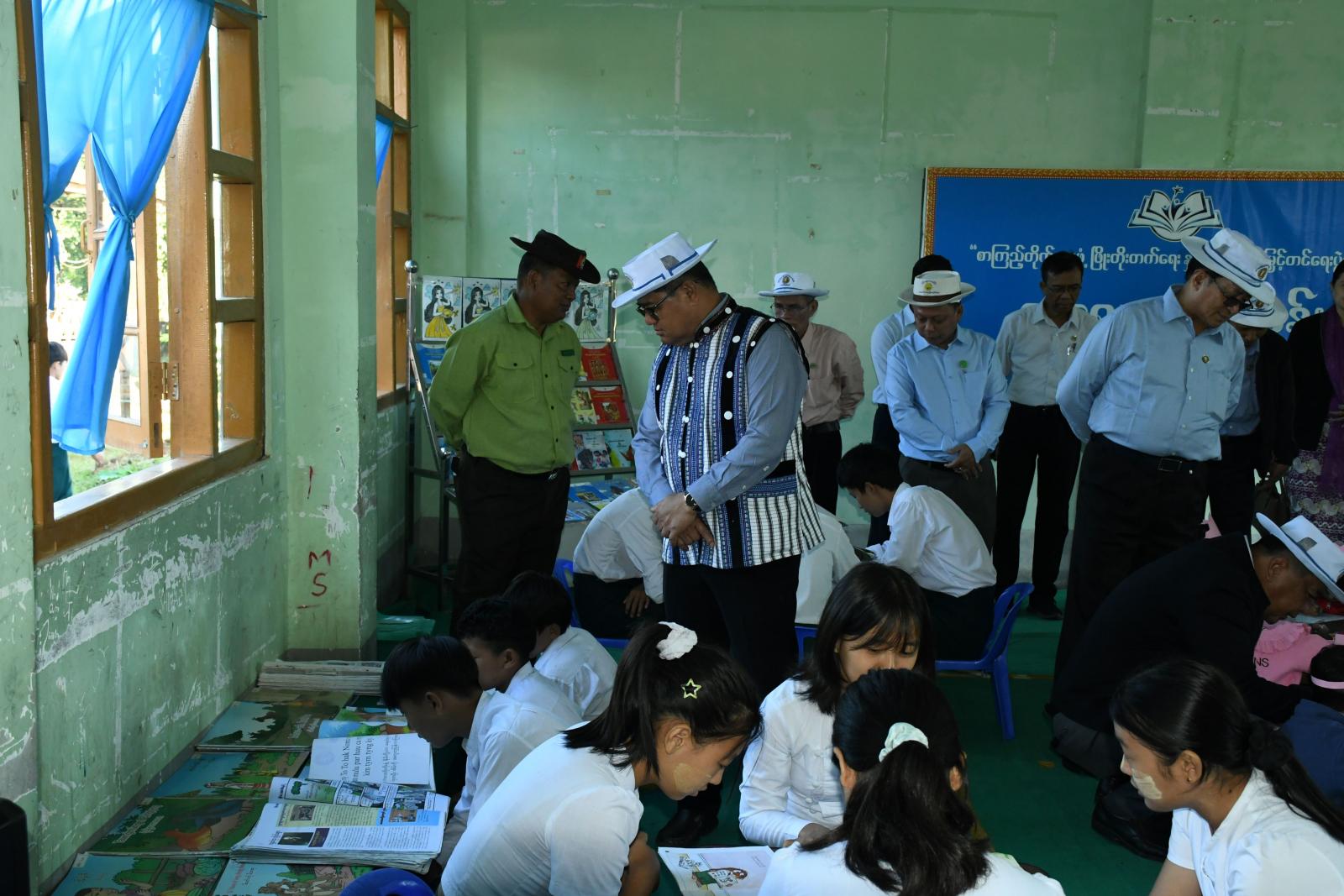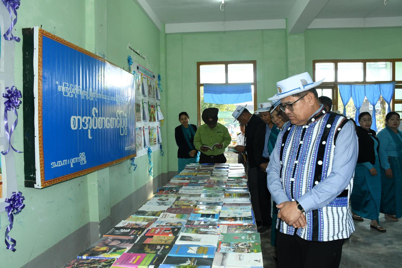 ထို့နောက် မြို့မရပ်ကွက်အတွင်းရှိ အခြေခံပညာအထက်တန်းကျောင်း(ပူတာအို)၌ ကချင်ပြည်နယ်အစိုးရအဖွဲ့၏ ကြီးကြပ်စီမံမှုဖြင့် ပြန်ကြားရေးနှင့်ပြည်သူ့ဆက်ဆံရေးဦးစီးဌာနနှင့် အခြေခံ ပညာဦးစီးဌာနတို့ ပူးပေါင်းကျင်းပသော စာကြည့်တိုက်များဖွံ့ဖြိုးတိုးတက်ရေးနှင့် စာဖတ်ရှိန်မြှင့်တင် ရေးပွဲသို့ တက်ရောက်ပြီး ဌာနဆိုင်ရာများ၊ ဘင်ခရာ၊ ပန်းပွားအဖွဲ့များ၊ ဌာနဆိုင်ရာများနှင့်အတူ ပွဲတော်အား ပြည်နယ်ဝန်ကြီးချုပ်၊ ပြည်နယ်ဝန်ကြီးများ၊ ပြန်ကြားရေးနှင့်ပြည်သူ့ဆက်ဆံရေးဦးစီးဌာန ညွှန်ကြားရေးမှူးနှင့် ခရိုင်စီမံခန့်ခွဲရေးနှင့်အုပ်ချုပ်ရေးကော်မတီ ဥက္ကဋ္ဌတို့က ဖဲကြိုး ဖြတ်ဖွင့်လှစ်ပေးကြသည်။