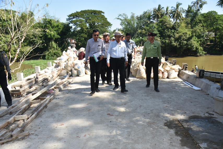 ထို့နောက် တိုင်းဒေသကြီးဝန်ကြီးချုပ်နှင့်အဖွဲ့သည် ကျုံပျော်ခရိုင်၊ ကျုံပျော်မြို့နယ်ရှိ နတ်ကန်ကျေးရွာနှင့် ဘိုးထောင့်ကျေးရွာသို့ ဆက်သွယ်ထားသော သံကူကွန်ကရစ်ယက်မ+ကြမ်းခင်း၊ သံကူကွန်ကရစ်ကမ်းကပ်ခုံ၊ တံတားအရှည် (၃၀၀) ပေရှိ ဒါးကချောင်းကူး (နတ်ကန်) တံတားတည်ဆောက်ခြင်းလုပ်ငန်း တတိယပိုင်းအား ကြည့်ရှုစစ်ဆေးခဲ့ပြီး စီမံကိန်းရှင်းလင်းဆောင်တွင် ကျေးလက်လမ်းဖွံ့ဖြိုးရေးဦးစီးဌာန၊ ညွှန်ကြားရေးမှူးက လုပ်ငန်းဆောင်ရွက်မှုအခြေအနေများကို ရှင်းလင်းတင်ပြရာ တိုင်းဒေသကြီးဝန်ကြီးချုပ်က လုပ်ငန်းများသတ်မှတ်ကာလအတွင်း ပြီးစီးရေးအတွက် အင်တိုက်အားတိုက်ဆောင်ရွက်ရန်နှင့် အရည်အသွေးပြည့်မီရေးကို အလေးထားဆောင်ရွက်ရန်မှာကြားခဲ့သည်။