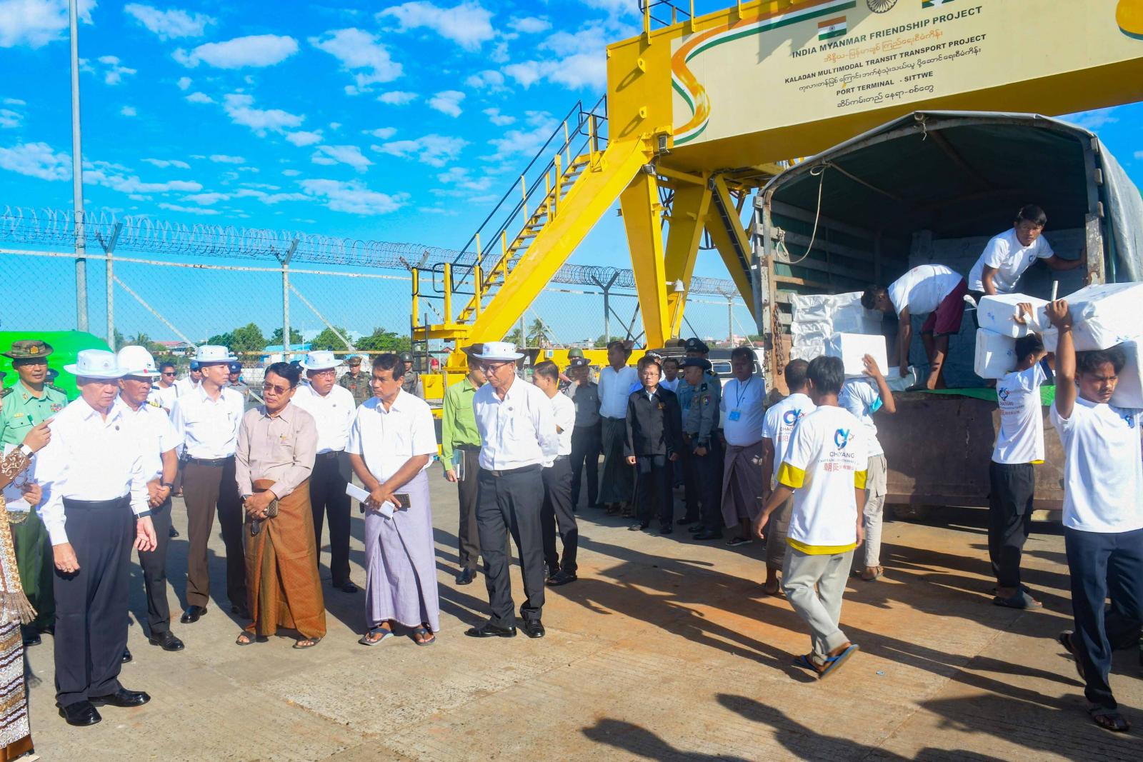 အမျိုးသားသဘာဝဘေးအန္တရာယ်ဆိုင်ရာစီမံခန့်ခွဲမှုကော်မတီ၏ လမ်းညွှန်မှုအရ ရခိုင်ပြည်နယ်အစိုးရအဖွဲ့နှင့် ရန်ကုန်တိုင်းဒေသကြီးအစိုးရအဖွဲ့၏ စီစဉ်ကြီးကြပ်မှုဖြင့် ရခိုင်ပြည်နယ်သို့ သင်္ဘောများဖြင့် ဆန်နှင့်အခြေခံစားသောက်ကုန်ပစ္စည်းများကို ပို့ဆောင်ပေးလျက်ရှိရာ စစ်တွေမြို့ ဘက်စုံသုံးဆိပ်ကမ်းတွင် အမ်ဗွီရဲထွန်းအောင်သင်္ဘောဖြင့် ရန်ကုန်မြို့မှ ဆန်နှင့်အခြေခံစားသောက်ကုန်ပစ္စည်းများ၊ လူသုံးကုန်ပစ္စည်းများ ရောက်ရှိလာမှုနှင့် အမ်ဗွီ ရွှေလမင်း(၅)သင်္ဘောဖြင့် ရေထွက်ပစ္စည်းများအား ရန်ကုန်မြို့သို့ တင်ပို့နိုင်ရန် ကုန်တင်ကုန်ချပြုလုပ်နေမှုကို ရခိုင်ပြည်နယ်ဝန်ကြီးချုပ် ဦးထိန်လင်းနှင့် ပြည်နယ်အစိုးရအဖွဲ့ဝင်များ၊ ဌာနဆိုင်ရာတာဝန်ရှိသူများသည် ယနေ့နံနက်ပိုင်းက သွားရောက်ကြည့်ရှုစစ်ဆေးကြသည်။