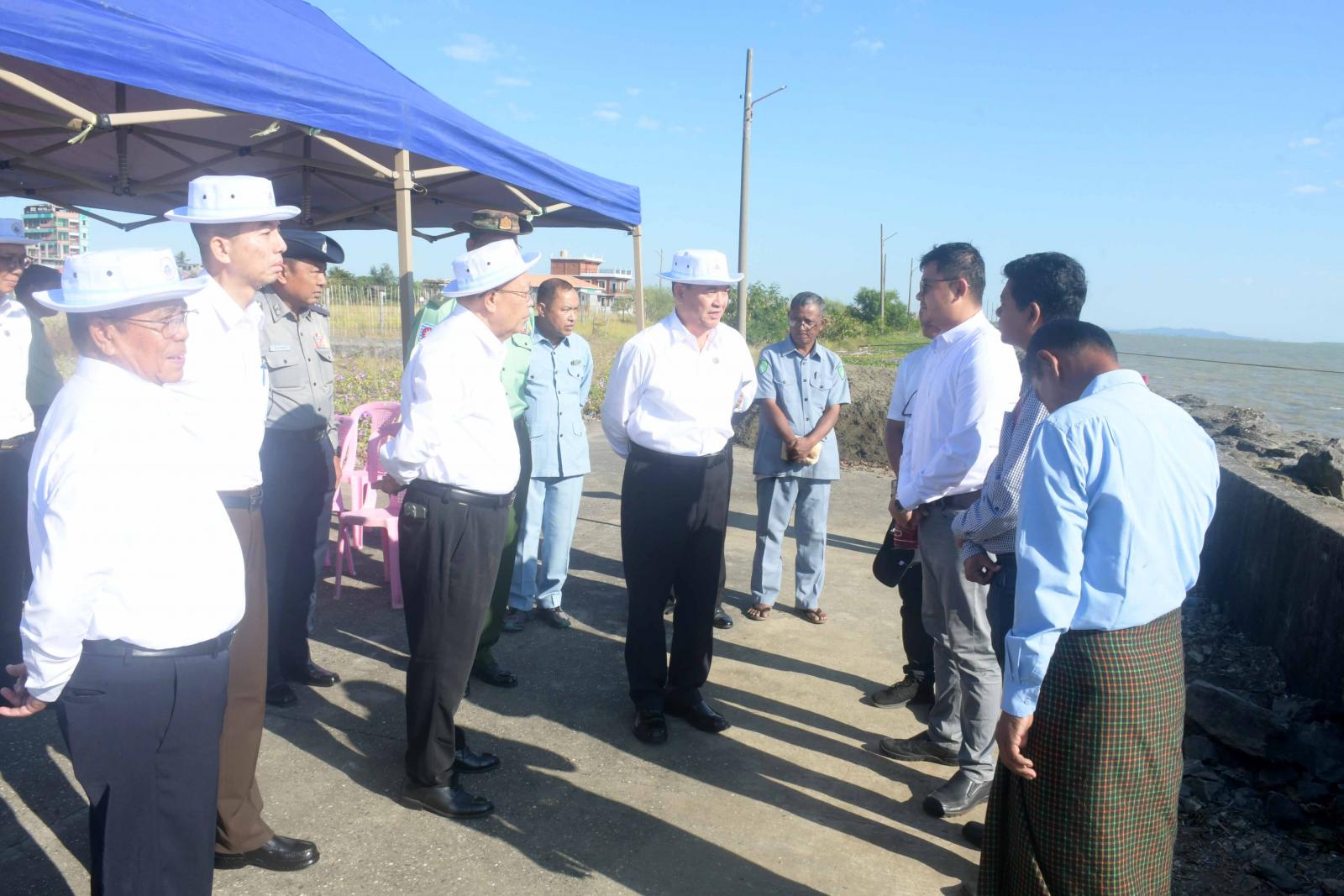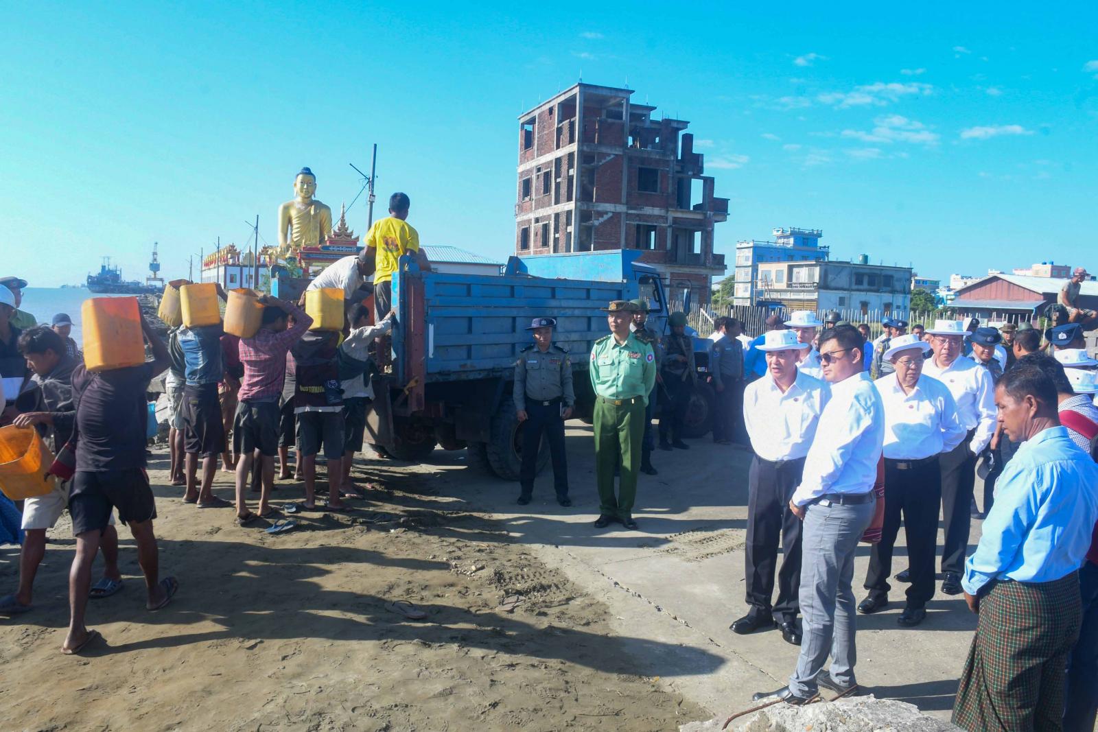 ဆက်လက်၍ ပြည်နယ်ဝန်ကြီးချုပ်နှင့်အဖွဲ့သည် အမ်ဗွီရွှေလမင်း(၅)သင်္ဘောဖြင့် ရေထွက်ပစ္စည်းများအား ရန်ကုန်မြို့သို့ တင်ပို့နိုင်ရန် ကုန်တင်ကုန်ချပြုလုပ်နေမှုကို ကြည့်ရှုစစ်ဆေး လိုအပ်သည်များကို တာဝန်ရှိသူများနှင့် ပေါင်းစပ်ညှိနှိုင်းပေးခဲ့သည်။ ထို့နောက်ပြည်နယ်ဝန်ကြီးချုပ်နှင့်အဖွဲ့သည်စစ်တွေမြို့၊ ဂစ္ဆပရပ်ကွက်တွင် တည်ဆောက်ရေးလုပ်ငန်းသုံးပစ္စည်းများအားအတင်အချပြုလုပ်နေမှုကို သွားရောက်ကြည့်ရှုစစ်ဆေးကြရာ ပြည်နယ်အစိုးရအဖွဲ့ဝင်များနှင့်လုပ်ငန်းရှင်များက ကုန်ပစ္စည်းများရောက်ရှိလာမှုနှင့် ကုန်တင်ကုန်ချပြုလုပ်နေမှုအခြေအနေများကို ရှင်းလင်းတင်ပြကြသည်။