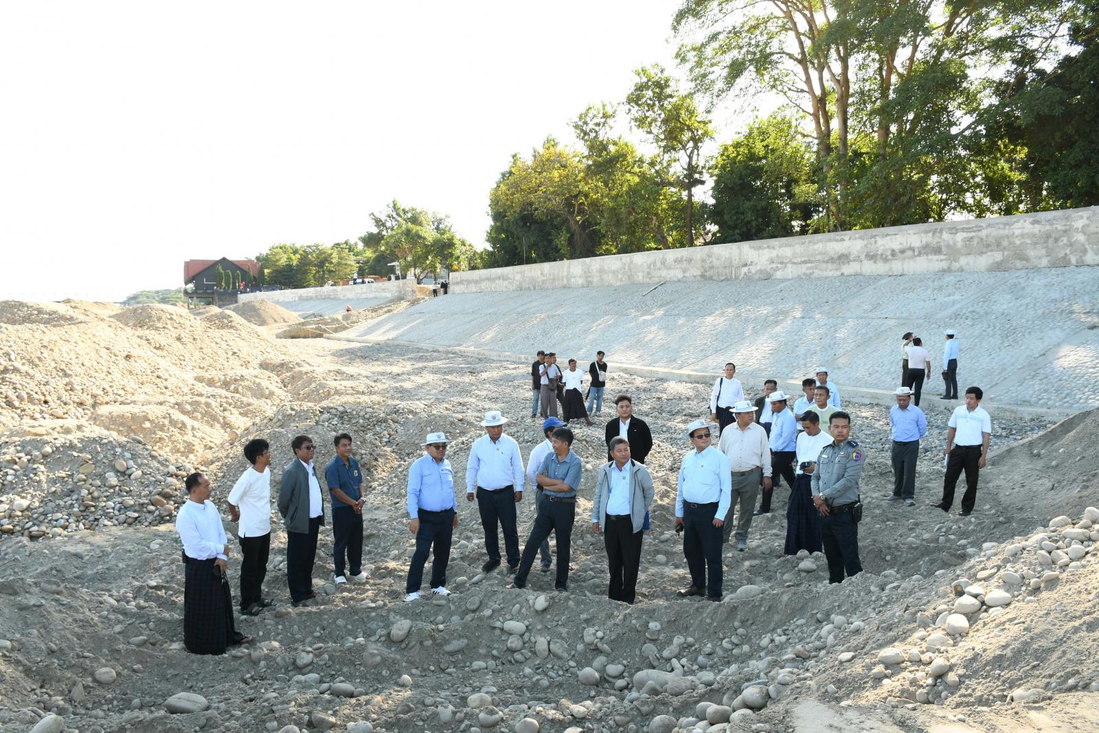 ထိုမှတစ်ဆင့် ပြည်နယ်ဝန်ကြီးချုပ်နှင့် တာဝန်ရှိသူများသည် မြစ်ကြီးနားမြို့ ဧရာဝတီမြစ်ရေ ကြီးမြင့်မှ ကာကွယ်နိုင်ရေးအတွက် ဗလမင်းထင်တံတား အထက်ဘက် ကမ်းထိန်းလုပ်ငန်းများဖြစ် သည့် မန်ခိန်ရပ်ကွက်အတွင်း ဧရာဝတီမြစ်ကမ်းပါး၌ ၂၀၂၅-၂၀၂၆ ဘဏ္ဍာရေးနှစ် ပြည်နယ်အစိုးရ အဖွဲ့၏ ငွေလုံးငွေရင်း ရန်ပုံငွေဖြင့် တည်ဆောက်လျက်ရှိသည့် ရေလျှံတားကျောက်စီမြေထိန်းနံရံနှင့် တမံ အလျား (၆၃၅)ပေ တည်ဆောက်ခြင်းလုပ်ငန်း စီမံကိန်းနေရာသို့ သွားရောက်ပြီး မြို့၏အမြင့်ဆုံးမြစ်ရေမြင့်တက်ခဲ့သည့် ၁၄၀၀ စင်တီမီတာအထက် ၁၄၅၀ စင်တီမီတာထိ ကာကွယ်နိုင်ရေး တည် ဆောက်ထားသည့် ရေလျှံတားကျောက်စီမြေထိန်းနံရံနှင့် တမံလုပ်ငန်းများ ဆောင်ရွက်ပြီးစီးမှု အခြေ အနေများကို လှည့်လည်ကြည့်ရှုစစ်ဆေးခဲ့ကြသည်။
