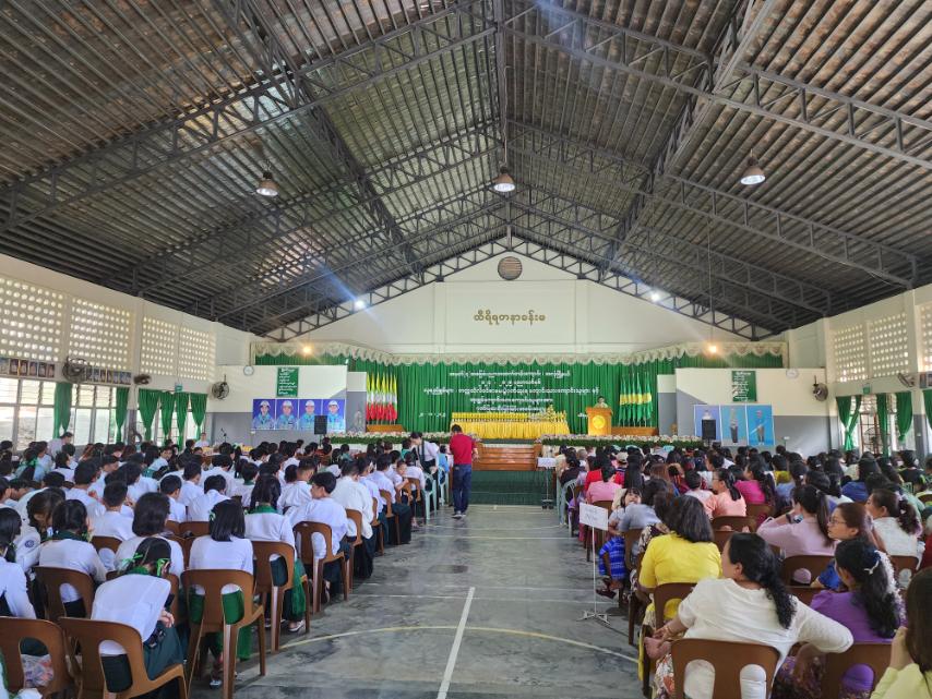 အခမ်းအနားတွင် Grade-10 ၊ Grade-11 ကျောင်းသား၊ ကျောင်းသူများက “ဘက်စုံပညာကိုရည် တို့လှမ်းချီ” သီချင်းဖြင့် ဖွင့်လှစ်ခဲ့ရာ မြို့နယ်စီမံခန့်ခွဲရေးနှင့်အုပ်ချုပ်ရေးကော်မတီဥက္ကဋ္ဌ ဦးရဲကိုကိုက ဂုဏ်ပြုအမှာစကားပြောကြားပြီးနောက် တာ၀န်ခံ ခရိုင်ပညာရေးမှူး ဒေါ်ခင်ချောစုလှိုင်က အဖွင့်အမှာစကားပြောကြားခြင်း၊ ကျောင်းအုပ်ကြီး ဒေါ်ဆွေဆွေသော်က အခမ်းအနားကျင်းပရခြင်းနှင့်ပတ်သက်၍ ရှင်းလင်းတင်ပြခြင်းနှင့် ကျေးဇူးတင်စကားပြောကြားခဲ့သည်။