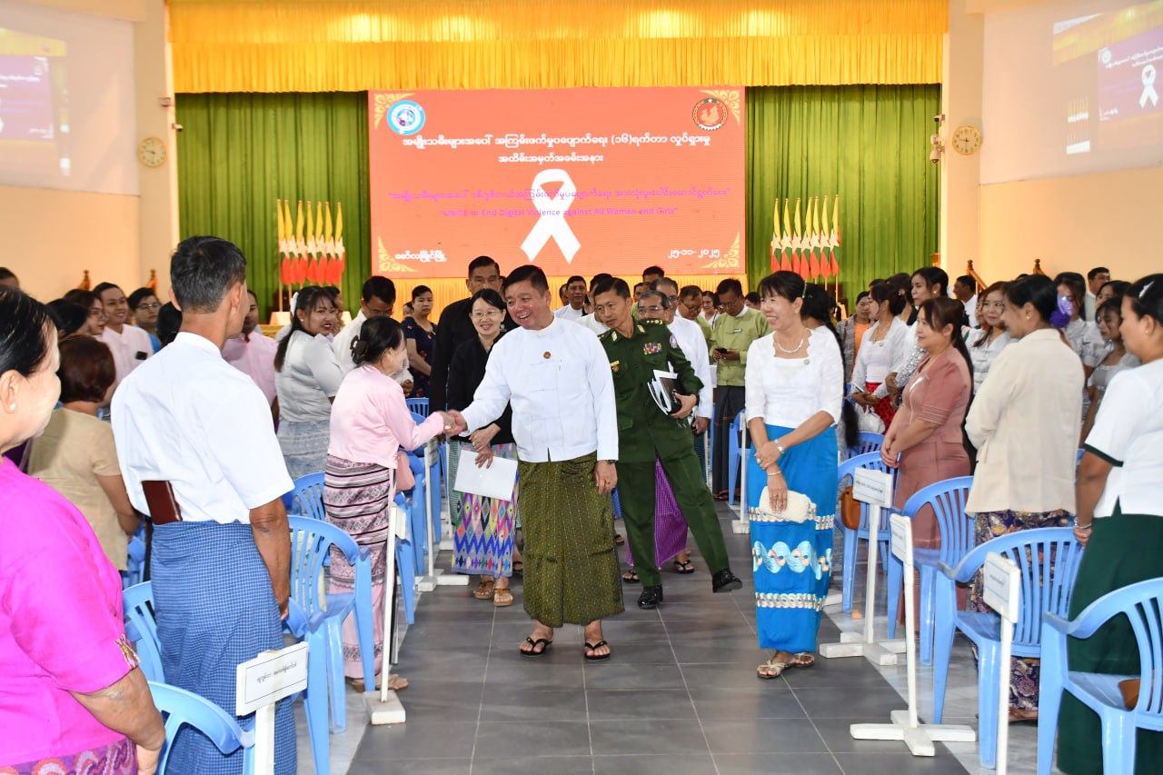 ထို့နောက် အမျိုးသမီးများအပေါ်အကြမ်းဖက်မှု တားဆီးကာကွယ်ရေးနှင့်အကြမ်းဖက်မှုပပျောက်ရေးမှတ်တမ်း Video ပြသခဲ့ပြီး ပြည်နယ်ဝန်ကြီးချုပ်နှင့် တာဝန်ရှိသူများက ပြည်နယ်၊ ခရိုင်၊ မြို့နယ် အမျိုးသမီးကော်မတီဝင်များအား ရင်းရင်းနှီးနှီး လိုက်လံနှုတ်ဆက်ခဲ့ပြီး ခန်းမအတွင်းပြသထားသည့် “အမျိုးသမီးများအပေါ်အကြမ်းဖက်မှုပပျောက်ရေး (၁၆) ရက်တာလှုပ်ရှားမှု” အထိမ်းအမှတ် ပြခန်းငယ်များအား လှည့်လည်ကြည့်ရှုအားပေးခဲ့ကြာင်း သိရှိရသည်။