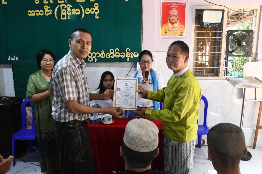 အခမ်းအနားတွင် မူးယစ်ဆေးစွဲသူများ ပြန်လည်ထူထောင်ရေးအသင်း(မြန်မာ)ဗဟိုမှဥက္ကဋ္ဌ ဦးစံရှိန်ကပွဲ ကျင်းပပြုလုပ်ရခြင်းနှင့်ပတ်သက်၍ အဖွင့်အမှာစကားပြောကြားခဲ့ပြီး မူးယစ်ဆေးစွဲသူများ ပြန်လည်ထူထောင်ရေးအသင်း(မြန်မာ)ဗဟိုမှ ကျောင်းသားလူငယ်ထု ဆက်သွယ်ရေးသံတမန် ဟာသသရုပ်ဆောင် လူရွှင်တော်ဦးချစ်ချောက မူးယစ်ဆေးဖြတ်ပြီး၍ နောက်ဆက်တွဲစောင့်ရှောက်မှုခံယူပြီးသည့် မူးယစ်ဆေးဖြတ်သင်တန်းသားများအား ဘဝအောင်မြင်တိုးတက်စေရေးအတွက် လမ်းညွှန်ဆုံးမစကားပြောကြားခဲ့သည်။ ဆက်လက်၍ သက်ဆိုင်ရာတာဝန်ရှိသူများက သင်တန်းဆင်းလက်မှတ်များအား အသီးသီးပေးအပ်ခဲ့ကြပြီး မူးယစ်ဆေးဖြတ် သင်တန်းဆင်းသင်တန်းသားတစ်ဦးနှင့် မိဘအုပ်ထိန်းသူတစ်ဦးတို့က ကျေးဇူးတင်စကားများ အသီးသီးပြန်လည်ပြောကြားခဲ့သည်။ ထို့နောက် မူးယစ်ဆေးစွဲသူများ ပြန်လည်ထူထောင်ရေးအသင်း(မြန်မာ)ဗဟိုမှဥက္ကဋ္ဌ ဦးစံရှိန်က မူးယစ်ဆေးဖြတ်သင်တန်းသားများ၏ မိဘအုပ်ထိန်းသူများနှင့်တွေ့ဆုံကာ သင်တန်းဆင်းသင်တန်းသားများ၏ စိတ်ပိုင်း၊ရုပ်ပိုင်းဆိုင်ရာ ပြောင်းလဲတိုးတက်လာမှု အခြေအနေများနှင့်ပတ်သက်၍ အသေးစိတ်ရှင်းလင်းပြောကြားခဲ့ပြီး တက်ရောက်လာကြသူများသည် သင်တန်းဆင်း သင်တန်းသားများ၊ ၎င်းတို့၏ မိဘအုပ်ထိန်းသူများနှင့်အတူ အမှတ်တရစုပေါင်းမှတ်တမ်းတင် ဓာတ်ပုံရိုက်ခဲ့ကြသည်။