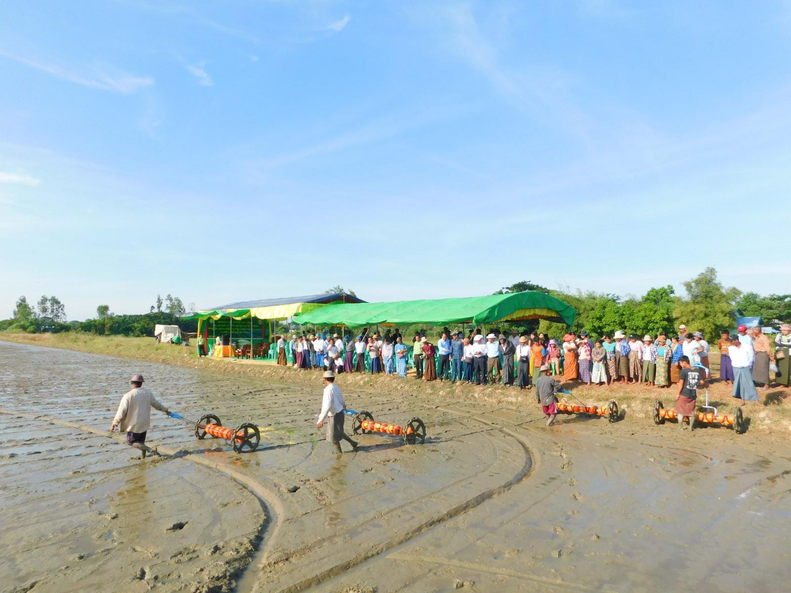 ရန်ကုန်တိုင်းဒေသကြီး၊ မှော်ဘီခရိုင်၊ ထန်းတပင်မြို့နယ်အတွင်းရှိ ဒေသခံတောင်သူများအား ရေဆင်းစပ်မျိုးနေကြာ (၁) အား မျိုးစေ့ချစက်ဖြင့် လက်တွေ့စိုက်ပျိုးပြသပေးခြင်းနှင့် နွေစပါးမျိုးစေ့ချကိရိယာ (Drum Seeder) ဖြင့် နွေစပါးလက်တွေ့စိုက်ပျိုးပြသပေးခြင်းအခမ်းအနားကို ယနေ့နံနက်ပိုင်းက ရေဖြူကျေးရွာအုပ်စုရှိ စက်မှုလယ်ယာစနစ်ကျလယ်ယာမြေအဖြစ် အကောင်အထည်ဖော်ဆောင်ရွက်ထားသည့် ဧက (၁၅၀) တွင် ကျင်းပပြုလုပ်ခဲ့ကြသည်။