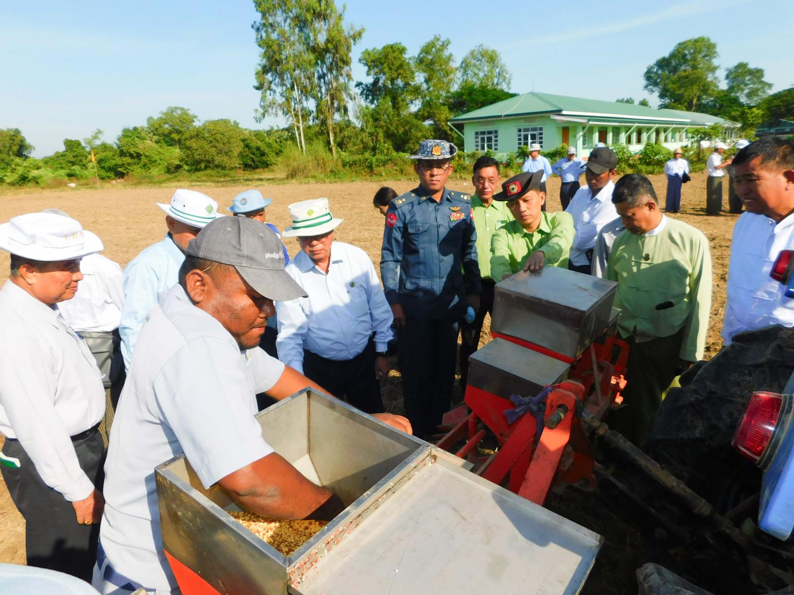 ဆက်လက်၍ မြို့နယ်တာဝန်ရှိသူများက ဒေသခံတောင်သူများအား နွေစပါးမျိုးစေ့ချကိရိယာ (Drum Seeder) ဖြင့် နွေစပါးလက်တွေ့စိုက်ပျိုးပြသပေးနေမှုအ ခြေအနေများနှင့် ရေဆင်းစပ်မျိုး ဆောင်းသီးနှံ (နေကြာ) ကို မျိုးစေ့ချစက်ဖြင့် လက်တွေစိုက်ပျိုးပြသပေးနေမှုအခြေအနေများအား တိုင်းဒေသကြီးနှင့်ခရိုင်တာဝန်ရှိသူများက လှည်လည်ကြည့်ရှုအားပေးခဲ့ကြကြောင်း သိရသည်။