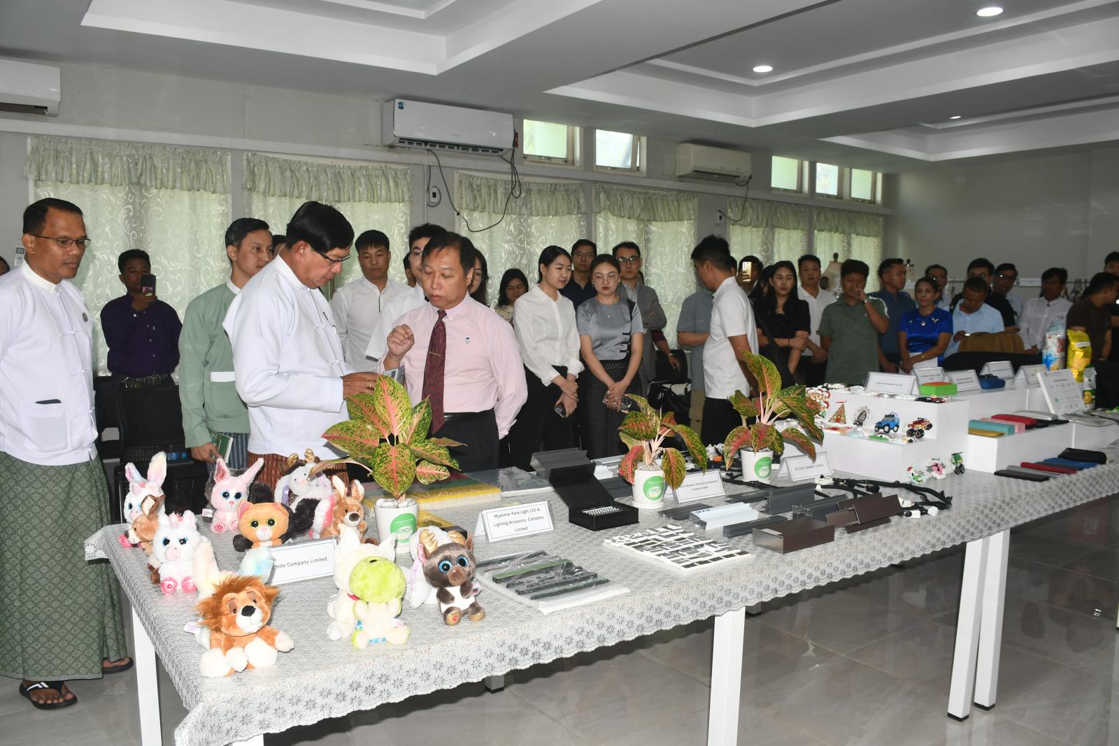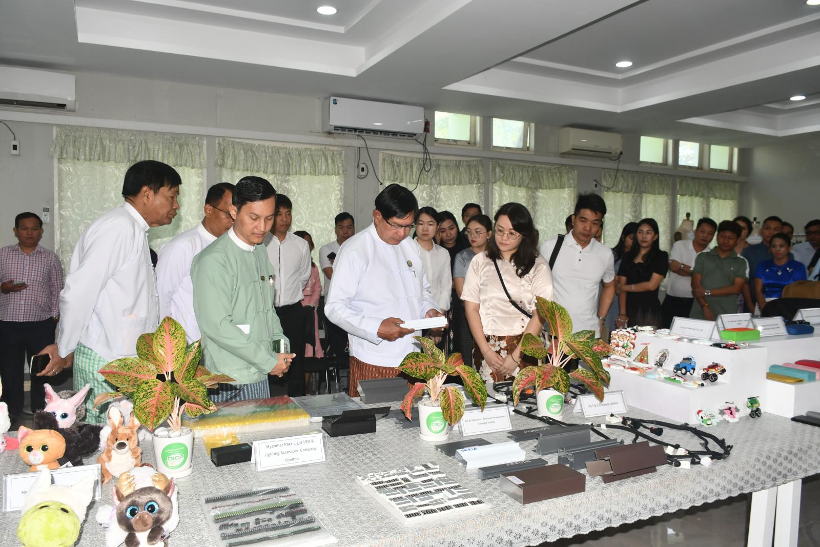 ဦးစွာ ရန်ကုန်တိုင်းဒေသကြီး ဝန်ကြီးချုပ် ဦးစိုးသိန်းနှင့် အဖွဲ့သည် ရင်းနှီးမြှုပ်နှံသူလုပ်ငန်းရှင်များ၏ ထုတ်လုပ်သည့်ပစ္စည်း နမူနာပြသထားရှိမှုများကို ကြည့်ရှုစစ်ဆေးကြသည်။