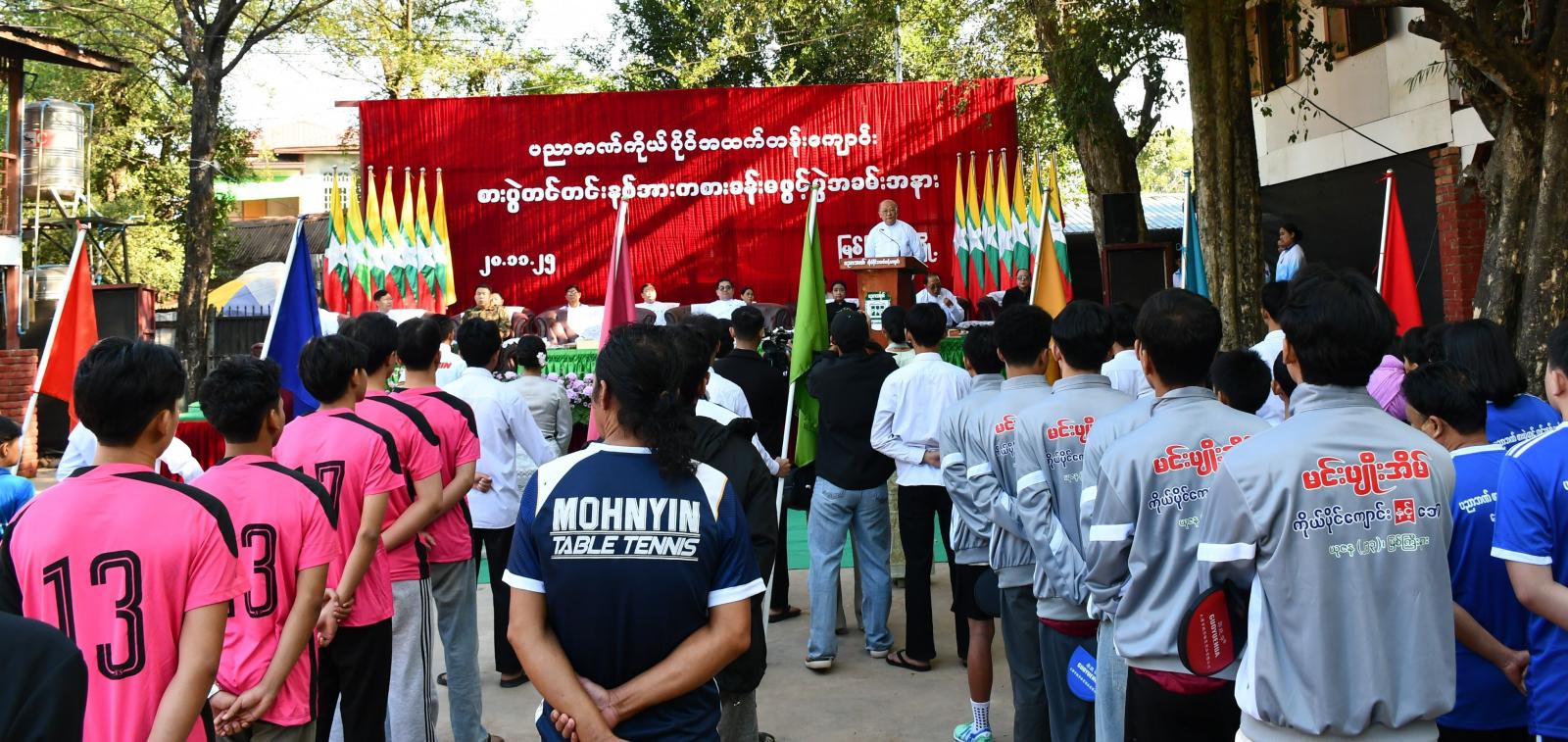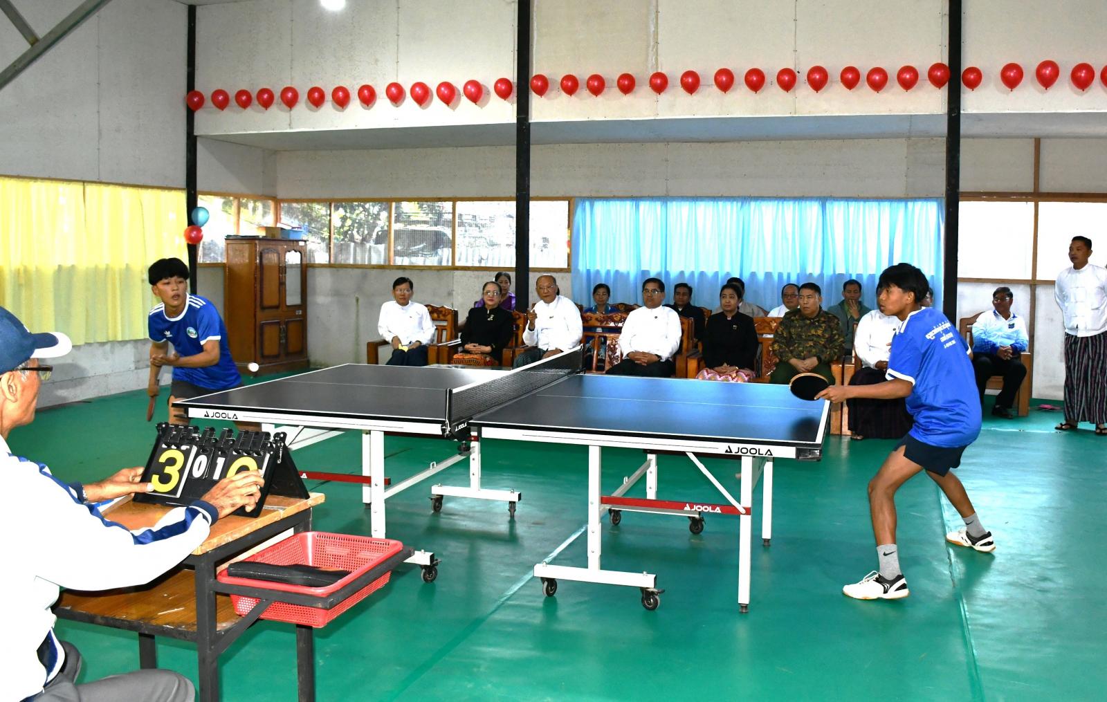 ထို့နောက် စားပွဲတင်တင်းနစ်အားကစားခန်းမဖွင့်ပွဲအခမ်းအနားကိုကျင်းပရာ ပြည်နယ်ဝန်ကြီးချုပ် ဦးခက်ထိန်နန်က ကြိုဆိုနှုတ်ခွန်းဆက်စကားပြောကြားပြီး ပြည်ထောင်စုဝန်ကြီးက ကျောင်းသား/ကျောင်းသူများ ကိုယ်ခန္ဓာကျန်းမာကြံ့ခိုင်ရေးနှင့် စိတ်ဓာတ်ကြံ့ခိုင်မှုအတွက် အားကစားသည် အလွန်အရေးပါသော အခန်းကဏ္ဍမှပါဝင်နေကြောင်း၊ စားပွဲတင်တင်းနစ် အားကစားနည်းသည် ကျန်းမာရေးအတွက်သာမက ဉာဏ်ရည်ဉာဏ်သွေး၊ မျက်စိအားကောင်းခြင်း၊ ဆင်ခြင်တုံတရားနှင့်လျင်မြန်သော တုံ့ပြန်မှုများကိုဖွံ့ဖြိုးစေသောအားကစားနည်းတစ်ခုလည်း ဖြစ်ပါကြောင်း၊ နိုင်ငံတော်အစိုးရအနေဖြင့်လည်း ကျန်းမာသန်စွမ်းသော လူငယ်များသည် နိုင်ငံတော်၏ အနာဂတ် အာမခံချက်ဖြစ်သည်ဟူသောမူဖြင့် နိုင်ငံတော်၏အနာဂတ်ကိုထူထောင်မည့်လူငယ်များ ကိုယ်စိတ်နှစ်ဖြာဖွံ့ဖြိုးတိုးတက်စေရေး၊ အားကစားစိတ်ဓာတ်ပြန့်ပွားစေရေးတို့ကို အထူးဦးစားပေးဆောင်ရွက်လျက်ရှိပါကြောင်း၊ သို့ဖြစ်ပါ၍ ယခုလိုကျောင်းများတွင် အားကစားလှုပ် ရှားမှုများ ပိုမိုကျယ်ပြန့်စွာ ဆောင်ရွက်နိုင်ရေးနှင့် အားကစားစွမ်းရည် မြင့်မားရေးတို့အတွက် လိုအပ်သော အထောက်အပံ့များကို ဆက်လက်ပံ့ပိုးပေးအပ်သွားမည်ဖြစ်ပါကြောင်းနှင့် ယနေ့အားကစားခန်းမမှတစ်ဆင့် အားကစားထူးချွန်သူအမြောက်အမြား ပေါ်ထွန်းလာအောင် ကြိုးစားကြစေလို ကြောင်း တိုက်တွန်းမှာကြားသည်။