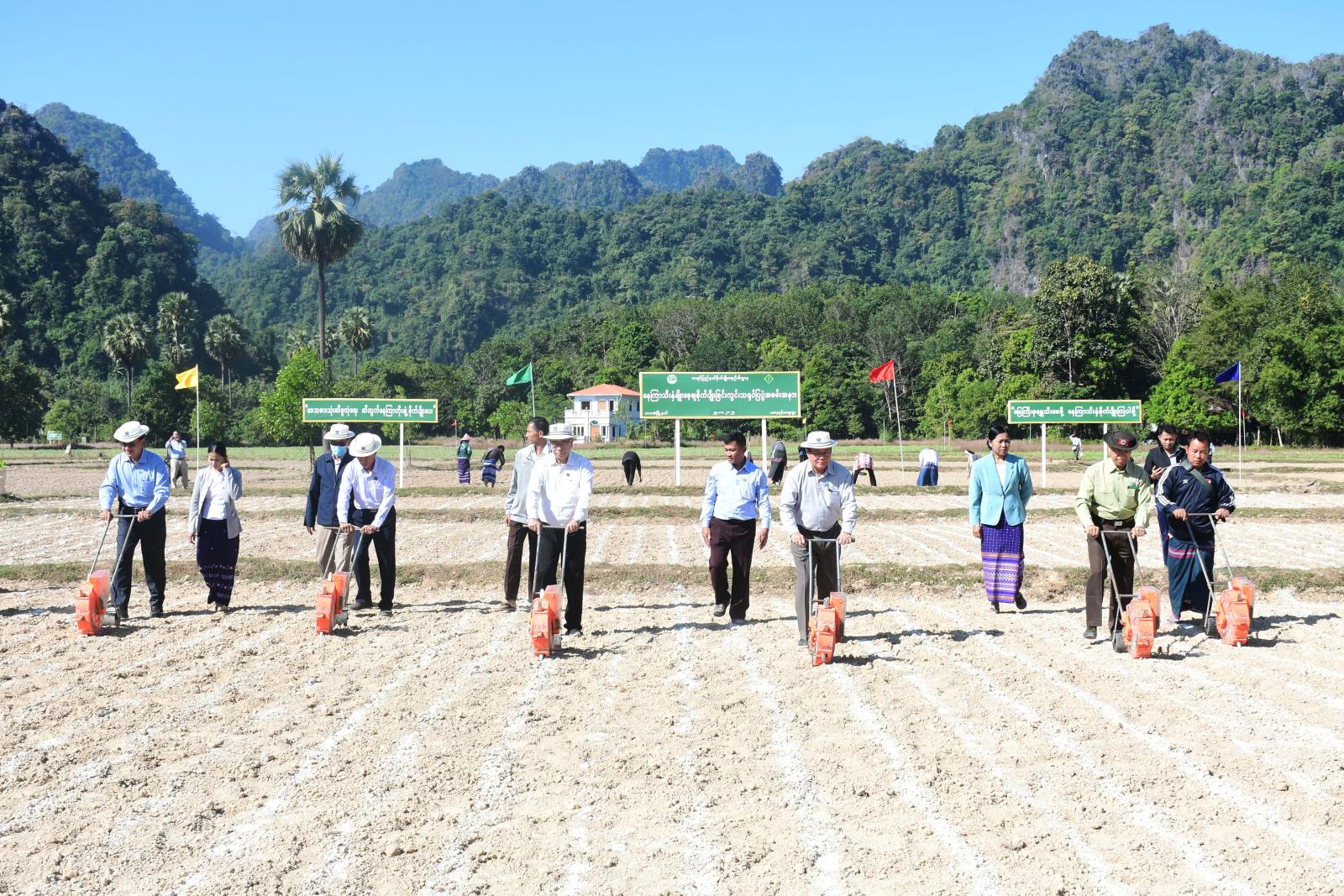 ထို့နောက် ဆောင်းနေကြာသီးနှံမျိုးစေ့ချစိုက်ပျိုးခြင်းကွင်းသရုပ်ပြပွဲကို ကျင်းပရာ ပြည်နယ်ဝန်ကြီးချုပ်က အမှာစကားပြောကြားပြီး ပြည်နယ်စိုက်ပျိုးရေးဦးစီးဌာနညွှန်ကြားရေးမှူးဦးထွန်းမြင့်က နေကြာ စိုက်ပျိုးခြင်းနှင့်ပတ်သက်၍ ရှင်းလင်းတင်ပြကာ မျိုးစေ့ချကိရိယာများဖြင့် နေကြာသီးနှံမျိုးစေ့ချ စိုက်ပျိုးခြင်းကွင်းသရုပ်ပြပွဲကိုကျင်းပရာ ပြည်နယ်ဝန်ကြီးချုပ်၊ ပြည်နယ်တရားလွှတ်တော် တရားသူကြီး ချုပ်၊ ပြည်နယ်အစိုးရအဖွဲ့ဝင်များကိုယ်တိုင် ပါဝင်သရုပ်ပြသခဲ့ကြပြီးကွင်းသရုပ်ပြခြင်းနှင့် တောင်သူများအစေ့ချစိုက်ပျိုးခြင်းတို့ကို ကြည့်ရှုအားပေးကာ တာဝန်ရှိသူများအား လိုအပ်သည်များ မှာကြားခဲ့သည်။