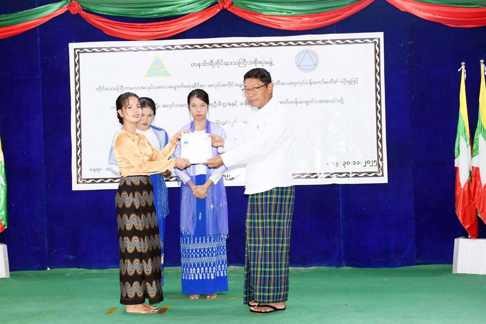 ဆက်လက်၍ တိုင်းဒေသကြီးကလေးအလုပ်သမားပပျောက်ရေးဆိုင်ရာအလုပ်အကိုင်အခွင့် အလမ်းများဖန်တီးပေးရေးလုပ်ငန်းကော်မတီဥက္ကဋ္ဌ၊ တိုင်းဒေသကြီးအစိုးရအဖွဲ့လူမှုရေးရာဝန်ကြီးနှင့် လုပ်ငန်းကော်မတီဝင်များကသင်တန်းသူ ၁၅ ဦးအား သင်တန်းဆင်းလက်မှတ်ပေးအပ်ပြီး သင်တန်းနည်းပြများအား ဂုဏ်ပြုချီးမြှင့်ငွေနှင့် လက်ဆောင်ပစ္စည်းများပေးအပ်ကာ သင်တန်းသူများကိုယ်စား သင်တန်းသူတစ်ဦးက ကျေးဇူးတင်စကား ပြောကြားသည်