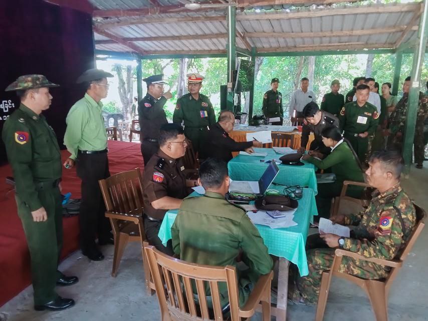 ထို့နောက် အမှတ် (၁၇) ကာကွယ်ရေးပစ္စည်းစက်ရုံ၊ ခန်းမဆောင်၌ အိမ်ထောင်စုလူဦးရေစာရင်းနှင့် နိုင်ငံသားစိစစ်ရေးကတ်ပြားပေးအပ်ပွဲ ကျင်းပရာ တိုင်းဒေသကြီးဦးစီးမှူး ညွှန်ကြားရေးမှူးဦးစောနိုင်က အဖွင့်အမှာစကားပြောကြားပြီး တာဝန်ရှိသူများက စစ်သည်၊ ရဲမေနှင့် မိသားစုဝင်များအား အိမ်ထောင်စုလူဦးရေစာရင်းနှင့် နိုင်ငံသားစိစစ်ရေးကတ်ပြားများ ပေးအပ်ကာ ဗိုလ်မှူးကြီးသိန်းလွင်က ကျေးဇူးတင်စကားပြန်လည်ပြောကြားခဲ့ကြောင်း သိရသည်။