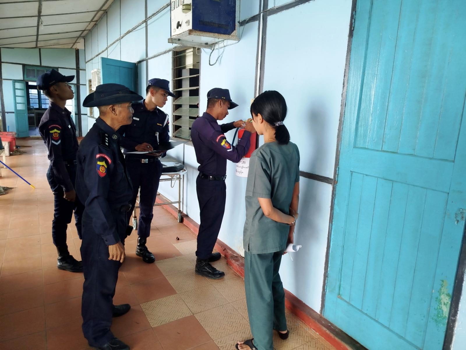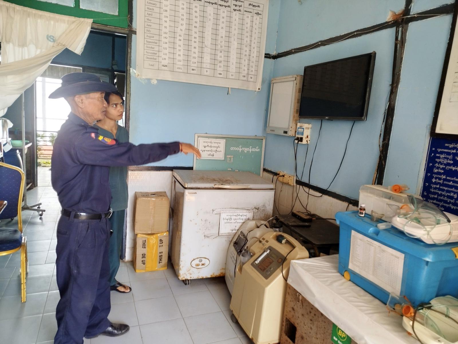 ထို့နောက် ဆေးရုံအတွင်း မီးဘေးအန္တရာယ်ကင်းရှင်းစေရန်အတွက် လျှပ်စစ်ဝိုင်ယာကြိုး သွယ်တန်းထားရှိမှုနှင့် လျှပ်စစ်ပစ္စည်းများ အသုံးပြုနေမှုများ၊ ရေစည်/ရေကန်များ စစ်ဆေးခြင်း၊ မီးချိတ်၊ မီးကပ်၊ ရေပုံး၊ သဲပုံးများ၊ မီးသတ်ဆေးဘူးများထားရှိမှု အခြေအနေများအား စစ်ဆေးခဲ့ကြောင်း သိရသည်။