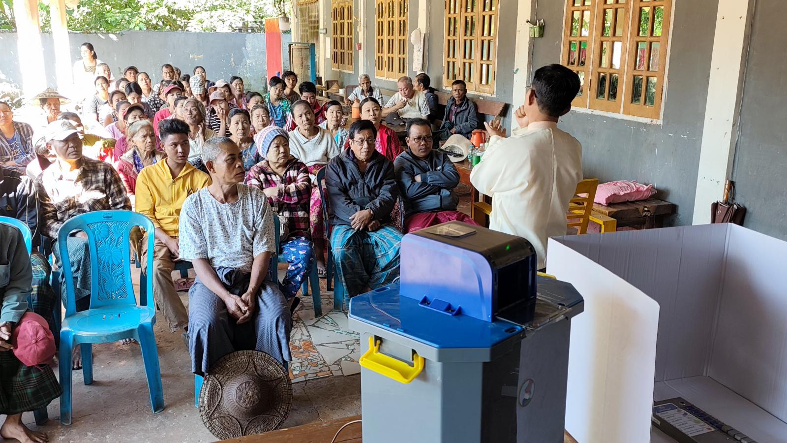 ပဲခူးတိုင်းဒေသကြီး၊ သာယာဝတီခရိုင်၊ ကြို့ပင်ကောက်မြို့နယ်အတွင်းရှိ ဒေသခံပြည်သူများ ရွေးကောက်ပွဲဆိုင်ရာ အသိပညာဗဟုသုတများ ရရှိစေရန်နှင့် မြန်မာအီလက်ထရောနစ်မဲပေးစက်အကြောင်း အသိပညာပေးရှင်းလင်းခြင်း၊ လက်တွေ့သရုပ်ပြစမ်းသပ်မဲပေးခြင်းများကို ကွင်းဆင်းဆောင်ရွက်ပေးလျက်ရှိရာ ဒီဇင်ဘာလ ၂ ရက်နေ့က နွယ်ခွေရပ်ကွက် အောင်မင်္ဂလာဘုန်းတော်ကြီးကျောင်းတွင် ဆောင်ရွက်ခဲ့သည်။