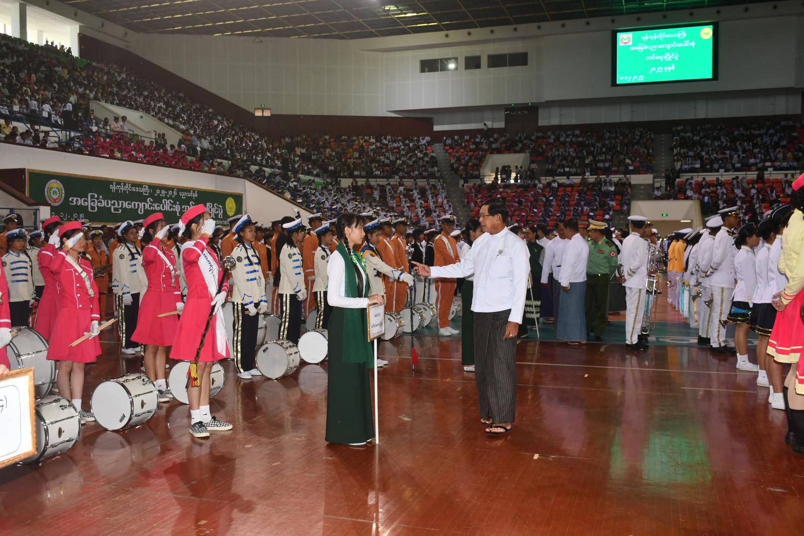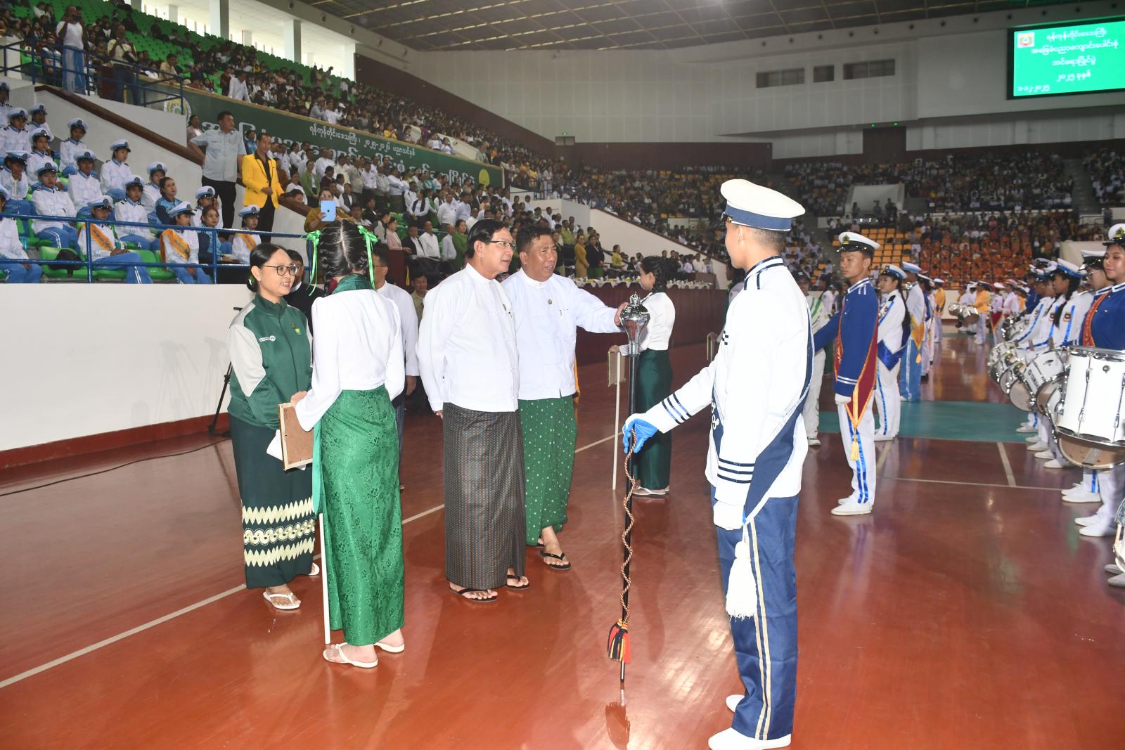ဆက်လက်၍ ရန်ကုန်တိုင်းဒေသကြီး ဝန်ကြီးချုပ် ဦးစိုးသိန်းနှင့်အဖွဲ့က ပြိုင်ပွဲဝင် ဘင်ခရာအဖွဲ့များမှ ကျောင်းသား၊ ကျောင်းသူများအား ရင်းရင်းနှီးနှီး လိုက်လံနှုတ်ဆက်ကြသည်။