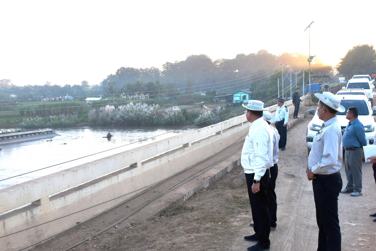 ယင်းနောက် မိုင်းဆတ်-တာချီလိတ်လမ်းမ ဆိုင်ခေါင်တံတား အရှယ် ၄၂၀ ပေ သံကူကွန်ကရစ်တံတား တည်ဆောက်နေမှုနှင့် နမ့်ကျန်းတံတား ချဉ်းကပ်လမ်းတည်ဆောက်နေမှုတို့ကို ကြည့်ရှုစစ်ဆေးရာ လမ်းဦးစီးဌာန၊ ရှမ်းပြည်နယ်(အရှေ့ပိုင်း)မှ ညွှန်ကြားရေးမှူး(မြို့ပြ) ဦးသူရဇော်နှင့် တာဝန်ခံ အင်ဂျင်နီယာတို့က လုပ်ငန်းဆောင်ရွက်ပြီးစီးအခြေအနေတို့ကို ရှင်းလင်းတင်ပြကာ ပြည်နယ်ဝန်ကြီးက လုပ်ငန်းများ သတ်မှတ်စံချိန်စံညွှန်းနှင့်အညီ အချိန်မီပြီးစီးရေး လိုအပ်သည်များ ပေါင်းစပ်ညှိနှိုင်း ဆောင်ရွက်ပေးခဲ့ကြောင်း သိရသည်။