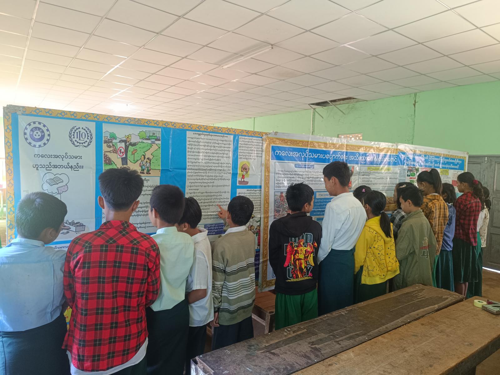 ထို့နောက် ပြန်ကြားရေးနှင့်ပြည်သူ့ဆက်ဆံရေးဦးစီးဌာနမှ ဝန်ထမ်းများက ကျောင်းသား/ကျောင်းသူများအား အသိပညာတိုးပွားစေမည့် ရုပ်ပုံပြဇာတ်နှင့်ရုပ်ပုံပါ ပုံပြင်စာအုပ်များဖြင့် ပုံပြင်ပြောပြခြင်း၊ အသိပညာဗဟုသုတရရှိစေမည့် စာအုပ်/စာစောင်များအားဖတ်ရှုစေခြင်း၊ ကလေးအလုပ်သမားပပျောက်ရေးအသိပညာပေးနံရံကပ်စာစောင်နှင့် လူကုန်ကူးမှုးနှင့်ပတ်သက်သည့် အသိပညာပေးနံရံကပ်စာစောင်များ ပြသခြင်းတို့ ဆောင်ရွက်ခဲ့ရာ ကျောင်းသား/ကျောင်းသူများက စိတ်ပါ၀င်စားစွာဖြင့် ကြည့်ရှုလေ့လာခဲ့ကြကြောင်း သိရသည်။