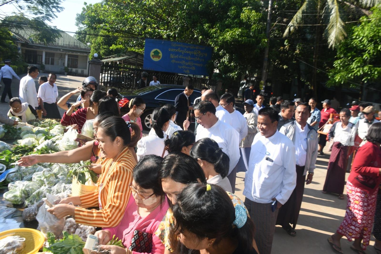 ရှေးဦးစွာ တိုင်းဒေသကြီးဝန်ကြီးချုပ် ဦးမျိုးဆွေဝင်းသည် ရှင်စောပုဝန်ထမ်းအိမ်ရာသို့ ရောက်ရှိခဲ့ရာ ဆန်၊ ဆီ၊ ကြက်သား၊ ဝက်သား၊ ကြက်ဥနှင့် ဟင်းသီးဟင်းရွက်မျိုးစုံတို့အား လက်လီအဆင့်ဆင့်မရှိဘဲ တိုက်ရိုက်ဈေးနှုန်းဖြင့် ရောင်းချနေမှု နိုင်ငံ့ဝန်ထမ်းများမှ ဝယ်ယူနေမှုတို့အား ကြည့်ရှုအားပေးခဲ့ပြီး ဝန်ထမ်းအိမ်ရာများတွင်သာမက အခြေခံစားသုံးကုန်များသာမက လူသုံးကုန်များလည်း ရောင်းချပေးသွားရန် တာဝန်ရှိသူများအား လမ်းညွှန်မှာကြားခဲ့သည်။