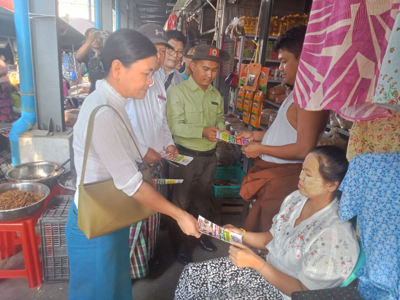 "ရွေးကောက်ပွဲမှသည် ပိုမိုကောင်းမွန်သောအနာဂတ်ဆီသို့" ဆောင်ပုဒ်နှင့်အညီ ဒီမိုကရေစီကို ပြန်လည်ဖော်ဆောင်ဖို့အတွက် ရွေးကောက်ပွဲမှလွဲ၍ အခြားနည်းမရှိပါ၊ ပြည်သူများလိုလားသည့် ဒီမိုကရေစီနိုင်ငံတော်ကို ရွေးကောက်ပွဲဖြင့်သာ ဖော်ဆောင်နိုင်ပါသည်၊ ဒီမိုကရေစီခိုင်မြဲဖို့ မဲရုံသွားပြီး မဲပေးကြပါစို့၊ နိုင်ငံဖွံ့ဖြိုးတိုးတက်ဖို့ ဦးဆောင်နိုင်သူရွေးချယ်ကြပါစို့" စသည့်အကြောင်းအရာများပါဝင်သော လက်ကမ်းစာစောင်များအား ဒုတိယမြို့နယ်အုပ်ချုပ်ရေးမှူး ဦးကျော်ကိုကို၊ ပြန်ကြားရေးနှင့်ပြည်သူ့ဆက်ဆံရေးဦးစီးဌာန မြို့နယ်ဦးစီးမှုး၊ မြို့နယ်စည်ပင်သာယာဝန်ထမ်းများ၊ မြို့နယ်မီးသတ်ဦးစီးဌာနမှ တာဝန်ရှိသူများ၊ မြို့နယ်အမျိုးသမီးရေးရာအဖွဲ့ဝင်များ၊ မြို့နယ်မိခင်နှင့် ကလေးစောင့်ရှောက်ရေးအသင်းဝင်များ၊ ရပ်ကွက်အုပ်ချုပ်ရေးမှုးများပါဝင်သောအဖွဲ့မှ ပြည်သူများ လက်ဝယ်အရောက် ဖြန့်ဝေပေးခဲ့ကြောင်း သိရသည်။