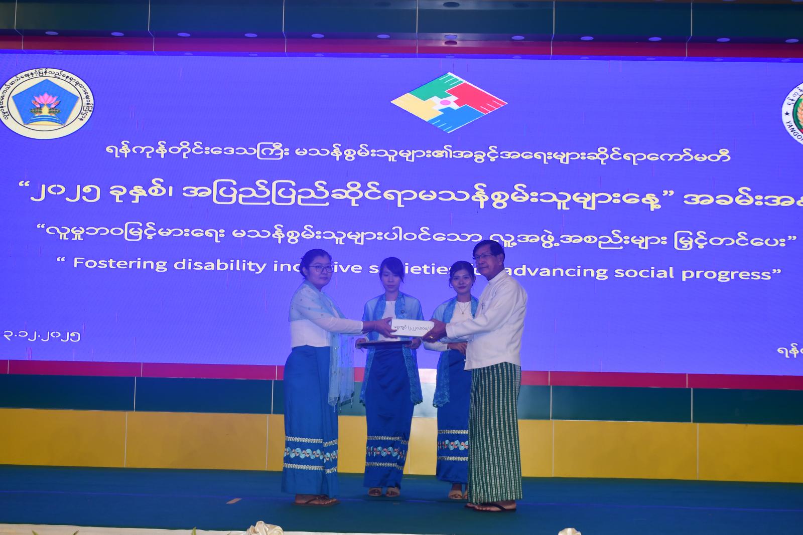 ဦးစွာ ရန်ကုန်တိုင်းဒေသကြီး ဝန်ကြီးချုပ် ဦးစိုးသိန်းက အဖွင့်အမှာစကားပြောကြားသည်။ ထို့နောက် ရန်ကုန်တိုင်းဒေသကြီး ဝန်ကြီးချုပ် ဦးစိုးသိန်းက ၂၀၂၄ ခုနှစ်၊ မတ်လမှ ဇူလိုင်လအထိ တရုတ်ပြည်သူ့သမ္မတနိုင်ငံ၊ လျောင်နင်ပြည်နယ်၊ ရှမ်းရန်မြို့နှင့် မလေးရှားနိုင်ငံ၊ ဆာဘားမြို့တို့၌ ပြုလုပ်ခဲ့သည့် (၉) ကြိမ်မြောက် အာရှကလေးများ အနုပညာပြပွဲတွင် ပန်းချီကား (၁) ချပ် ပေးပို့ပါဝင်ယှဉ်ပြိုင်ခဲ့ပြီး ပထမဆုရရှိခဲ့သည့် မသန်စွမ်းကလေးများ ပြုစုစောင့်ရှောက်ရေးဂေဟာမှ မောင်ရဲလေးအား ဂုဏ်ပြုချီးမြှင့်ငွေများဖြင့်လည်းကောင်း၊ ရန်ကုန်တိုင်းဒေသကြီးအတွင်းရှိ မသန်စွမ်းကျောင်းများဖြစ်သည့် မသန်စွမ်းသက်ကြီးသင်တန်းကျောင်း၊ မသန်စွမ်းသက်ငယ်သင်တန်းကျောင်း၊ နားမကြားသော ကလေးများကျောင်း၊ ကြည့်မြင်တိုင်မျက်မမြင်ကျောင်း၊ မသန်စွမ်းကလေးများ ပြုစုစောင့်ရှောက်ရေးဂေဟာ၊ မသန်စွမ်းသက်ကြီးစောင့်ရှောက်ရေးဂေဟာ (ထောက်ကြန့်)၊ မေရီချက် (ပ်) မင်းနားမကြားသော ကလေးများကျောင်း၊ ခဝဲခြံမျက်မမြင်ကျောင်း၊ အေးမေတ္တာမသန်စွမ်းရိပ်မြုံပရဟိတဂေဟာနှင့် ဧဒင်မသန်စွမ်းရိပ်မြုံပရဟိတဂေဟာတို့မှ တာဝန်ရှိသူများထံ ချီးမြှင့်ငွေများဖြင့်လည်းကောင်း အသီးသီးပေးအပ်ခဲ့သည်။