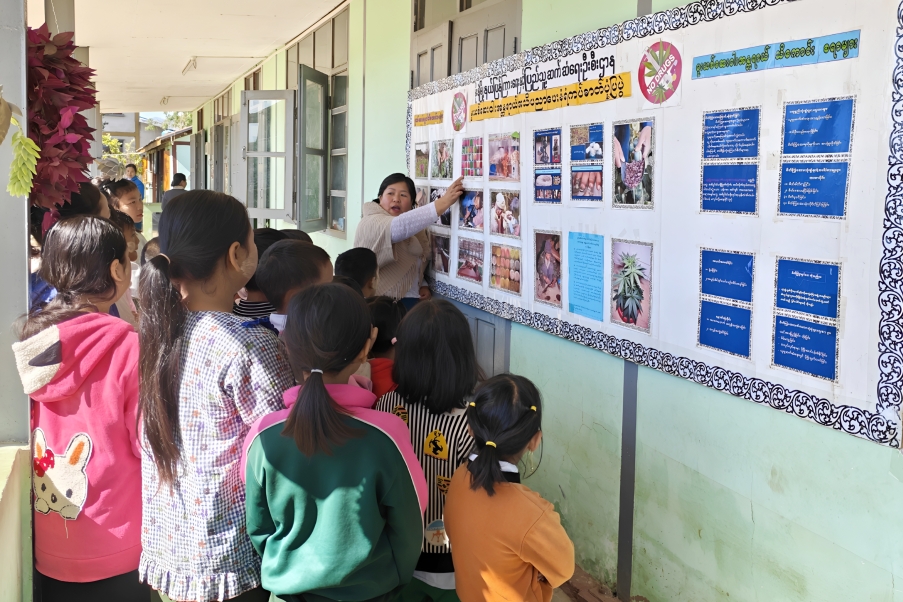 ထို့နောက် ချိတ်ဆွဲပြသထားသော မူးယစ်ဆေးဝါးအန္တရာယ် အသိပညာပေး နံရံကပ်စာစောင်နှင့် ဓာတ်ပုံများကိုပြသရာ ကျောင်းသား၊ ကျောင်းသူလေးများက စိတ်ပါဝင်စားစွာ ကြည့်ရှုခဲ့ကြောင်း သိရသည်။