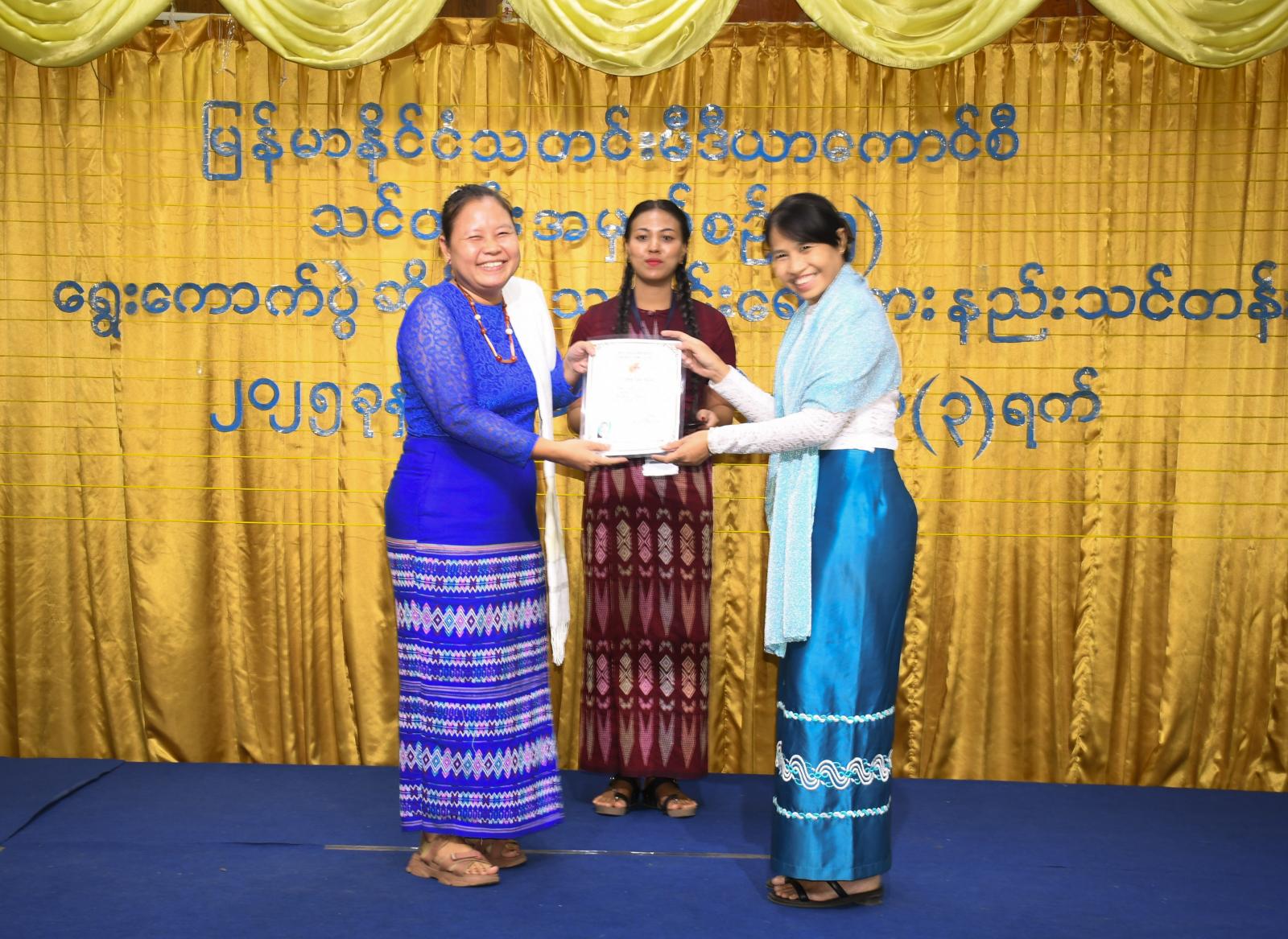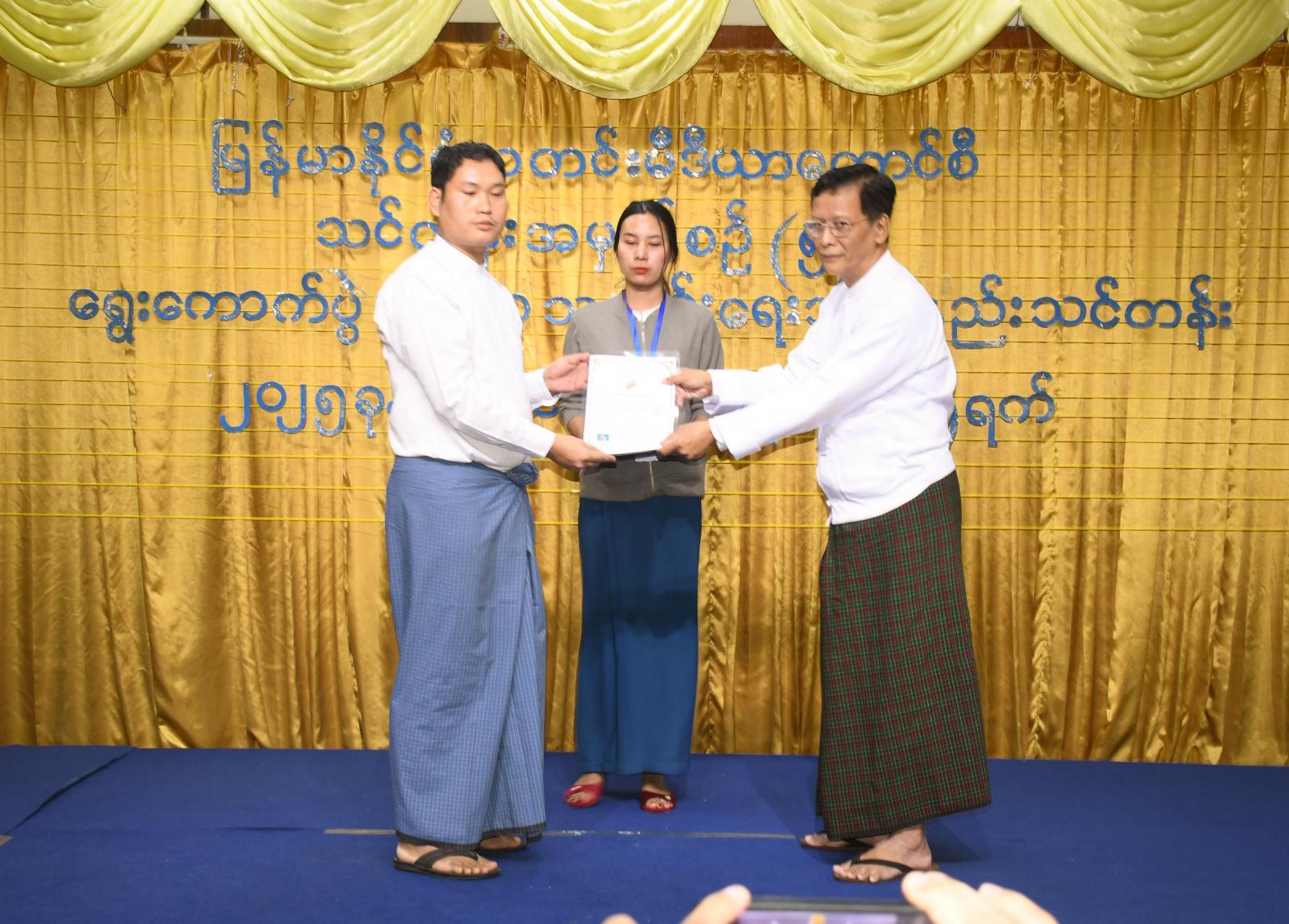 ထို့နောက် မြန်မာနိုင်ငံသတင်းမီဒီယာကောင်စီဥက္ကဋ္ဌနှင့် ကောင်စီဝင်များ၊ မီဒီယာဖွံ့ဖြိုးတိုးတက်ရေးဦးစီးဌာန ဒုတိယညွှန်ကြားရေးမှူးချုပ်၊ ရန်ကုန်တိုင်းဒေသကြီး ပြန်ကြားရေးနှင့်ပြည်သူ့ဆက်ဆံရေးဦးစီးဌာနမှ ဒုတိယညွှန်ကြားရေးမှူးနှင့် တာဝန်ရှိသူများက သင်တန်းသား၊ သင်တန်းသူများအား သင်တန်းဆင်းလက်မှတ်များ ပေးအပ်ကြသည်။