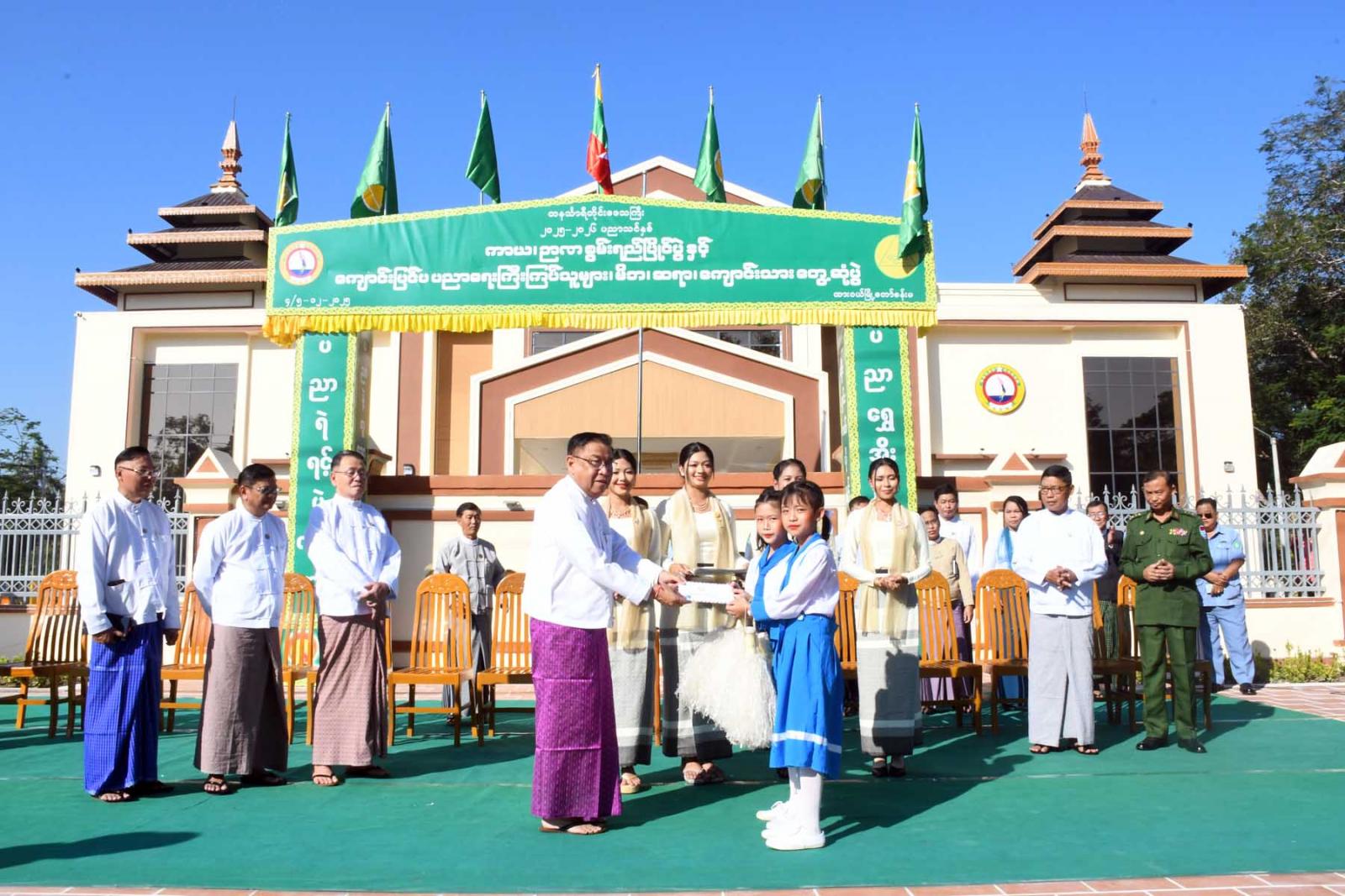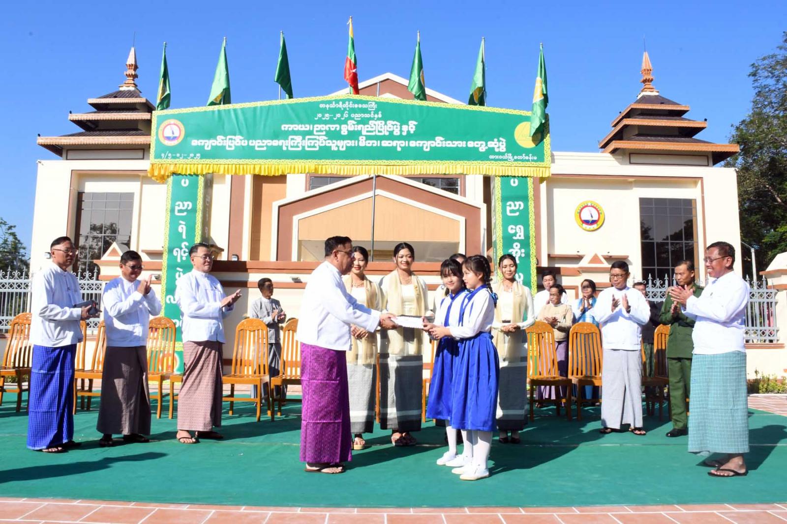ထို့နောက်တိုင်းဒေသကြီးဝန်ကြီးချုပ်ဦးမြတ်ကိုက တီးခတ်ပေးသော ဘင်ခရာအဖွဲ့နှင့်ကျောင်းပေါင်းစုံမှ ပန်းပွားအဖွဲ့များအား ဂုဏ်ပြုဆုငွေများ ချီးမြှင့်သည်။