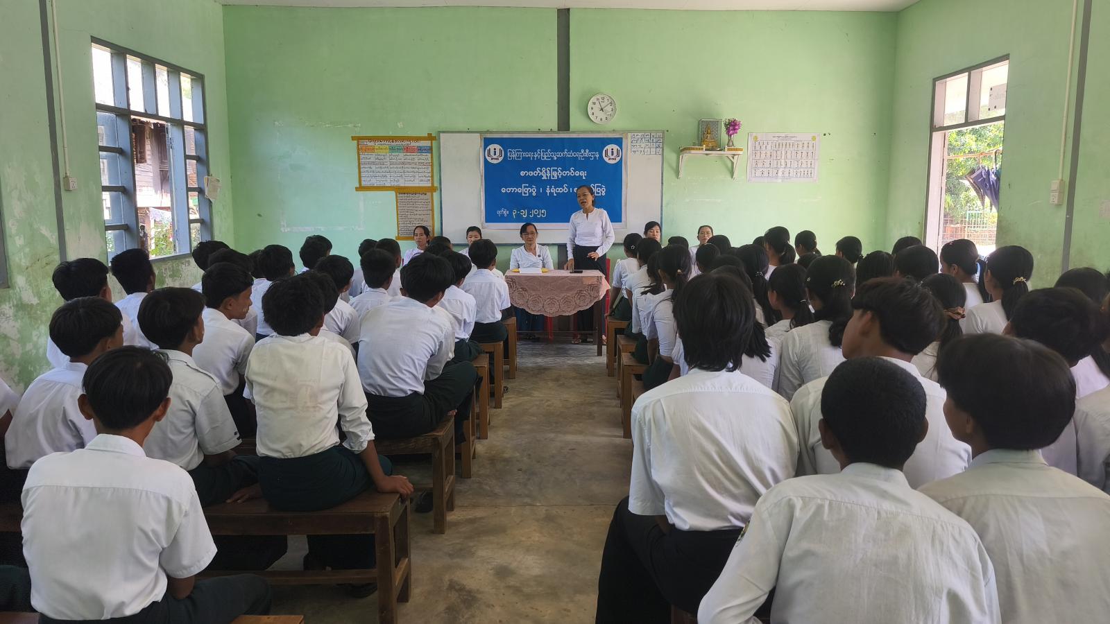 ဦးစွာ ကျောင်းအုပ်ဆရာမကြီး ဒေါ်ခင်သန်းအေးက အမှာစကားပြောကြားပြီး မုဒုံမြို့နယ် ပြန်ကြားရေးနှင့် ပြည်သူ့ဆက်ဆံရေးဦးစီးဌာနမှ ဦးစီးအရာရှိ ဒေါ်မိုးမိုး စန္ဒာထွန်းက ကျောင်းသား/သူများ အသိပညာဗဟုသုတများ ပြည့်စုံစေရန်နှင့် စာဖတ်ရှိန်မြင့်မား စေရေးအတွက် ကျောင်းစာအပြင် ပြင်ပစာပေများဖြစ်သည့် ရုပ်ပြ၊ ကာတွန်း စသည့် စာအုပ်စာစောင်များကို လေ့လာဖတ်ရှုကြရန်နှင့် အကျိုးအကြောင်း၊အဆိုးအကောင်းများကို ဝေဖန်ပိုင်းခြားနိုင်ရေးအတွက် စာပေများ ဖတ်ရှုလေ့လာကြရန်ပြောကြားသည်။ ထို့နောက် စားသုံးသူကာကွယ်ရေး အကြောင်းအရာများ၊ ကလေးအလုပ်သမားပပျောက်ရေး အသိပညာပေးခြင်းနှင့် လူကုန်ကူးမှုအန္တရာယ်အကြောင်းအရာများကို ရှင်းလင်းပြောကြားခဲ့သည်။